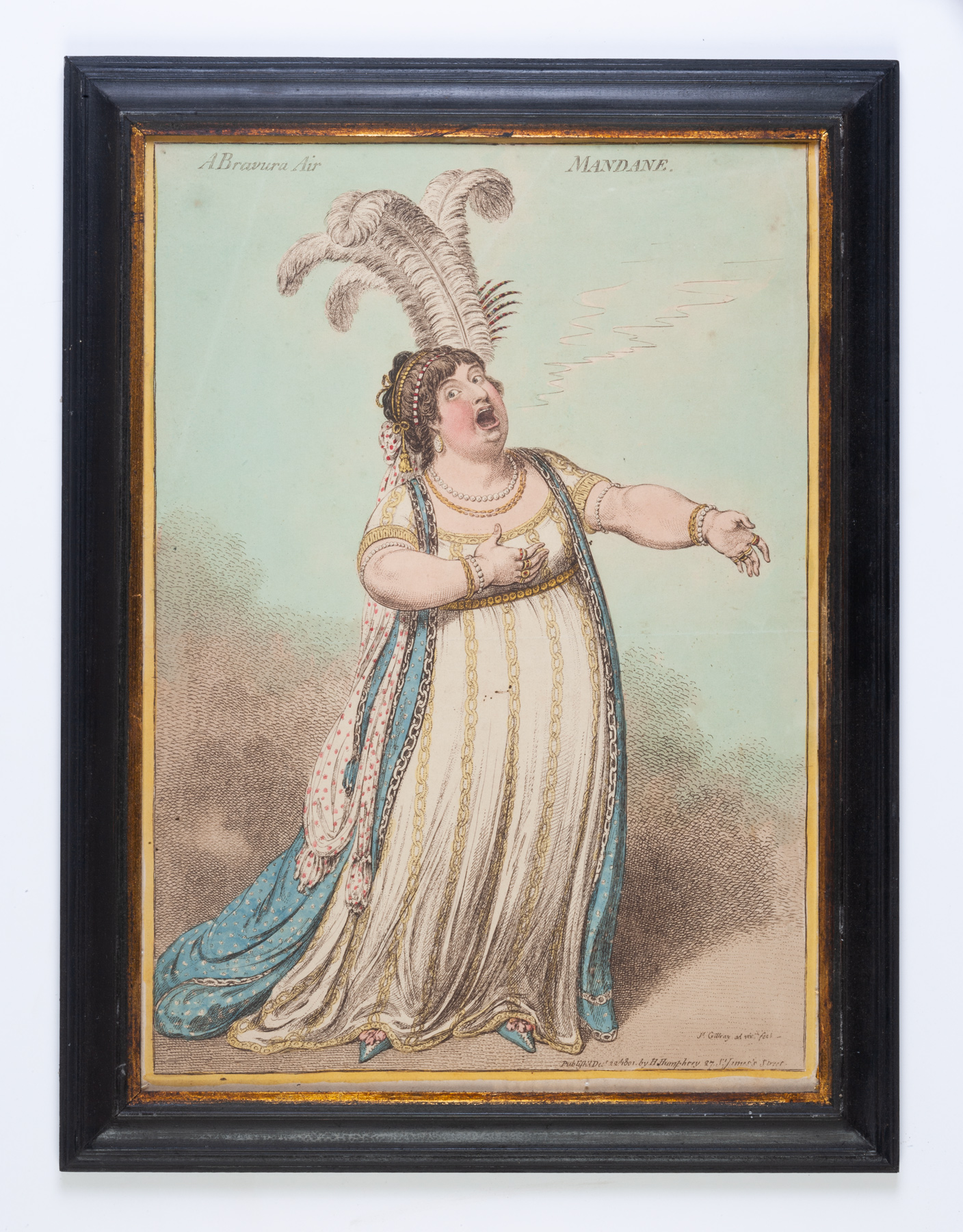The singer caused a sensation when returning to the London stage in 1801, the year this print was published. Her first performance at Covent Garden was in the part of Mandane in the opera Artaxerxes, and is satirized here due to her ‘inelegant attitude of pressing her hands against her bosom in passages that require exertion. It never fails to communicate ides of labour, struggle and pain’. (Secrert History of the Green Room. ii.75)