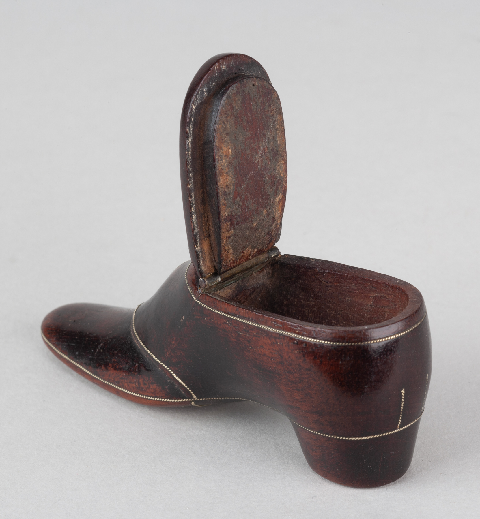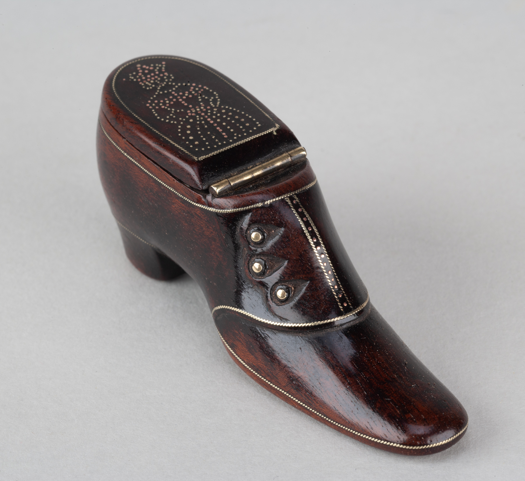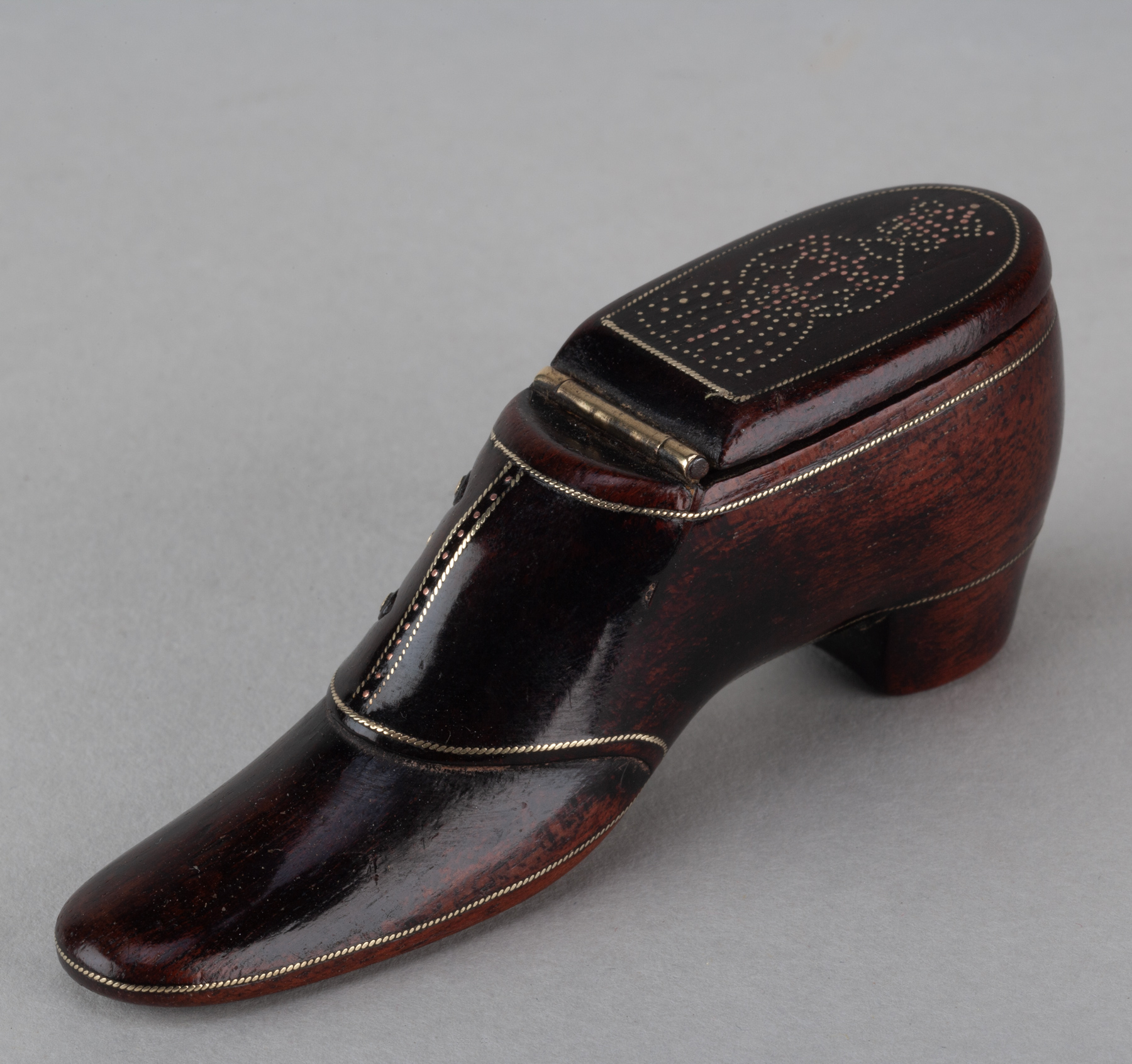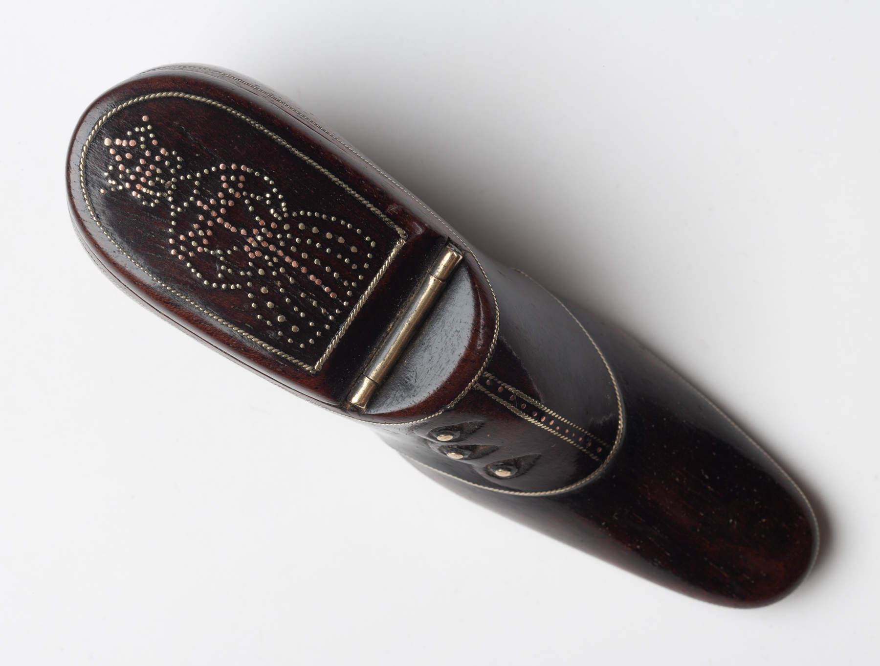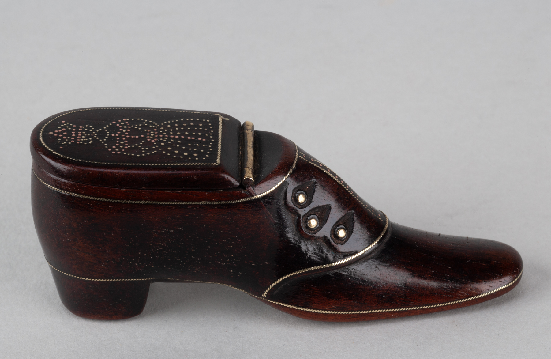 These snuff shoes are sometimes dated and when so to around 1840. The hinged lid of this example carries a design of a crowned queen, perhaps the new Queen Victoria, and so made during the year of 1838.