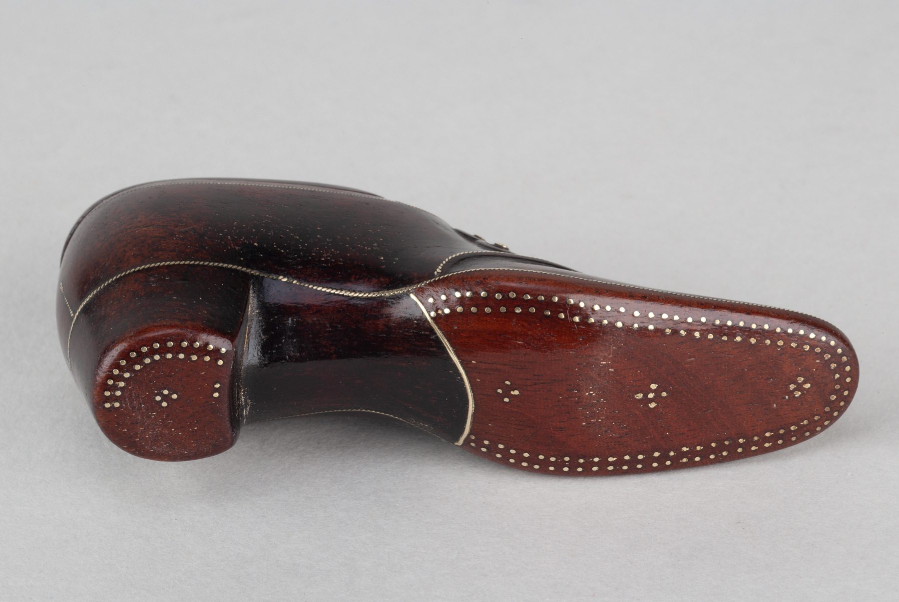 Made with a cobblers’ know how, the pins to the shoe’s sole authentically positioned whilst a twisted and flattened wire make a good job of suggesting the shoe’s welt seam. Three buttons securely hold over the shoe’s vamp.