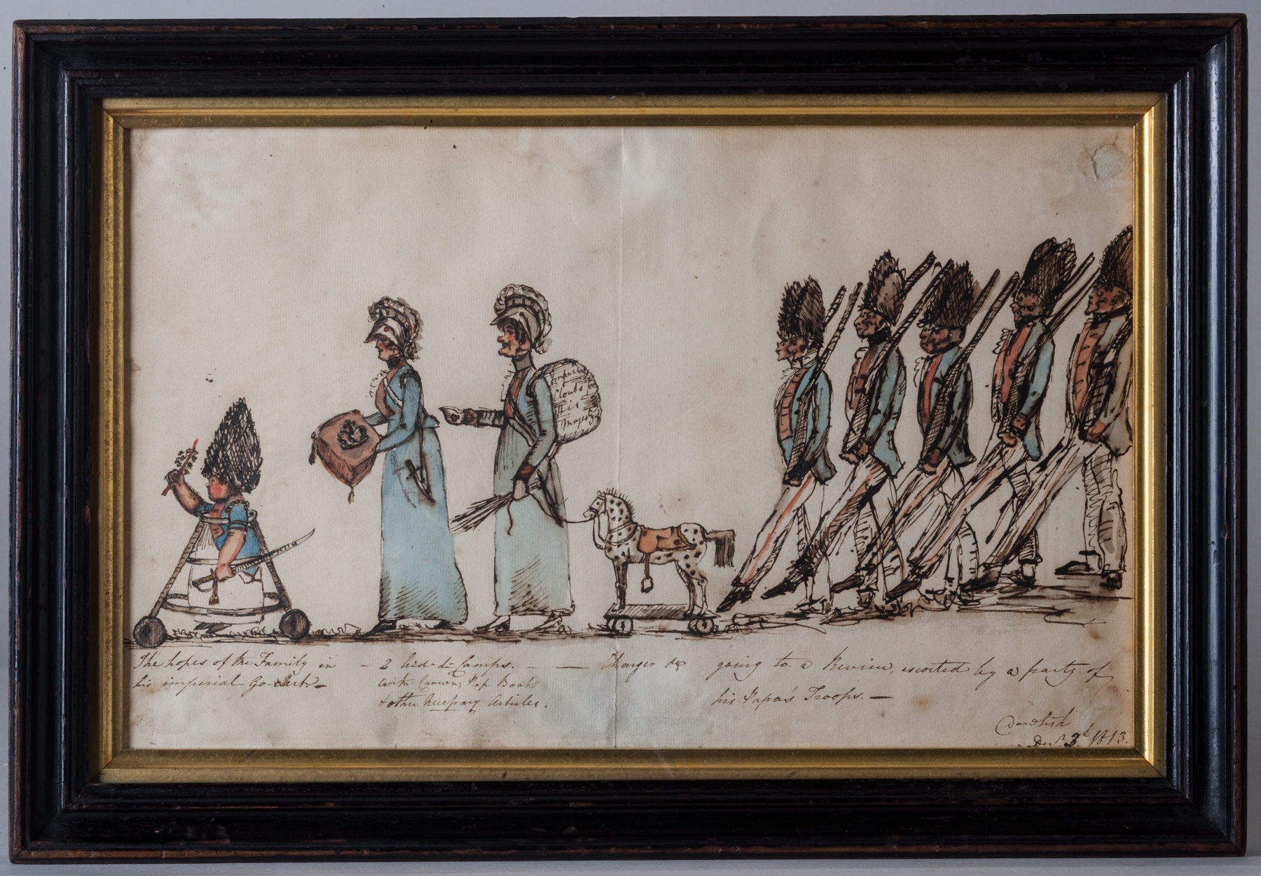 “The hopes of the family in his imperial go-cart”; his sword in one hand; rattle in the other, being followed by “2 aide de Camps with Crown, Pap Boat and other Company Articles”, “Charger”, the child’s pull-a-long wooden horse, “Going to a Review escorted by a party of His Papa’s Troops”.
