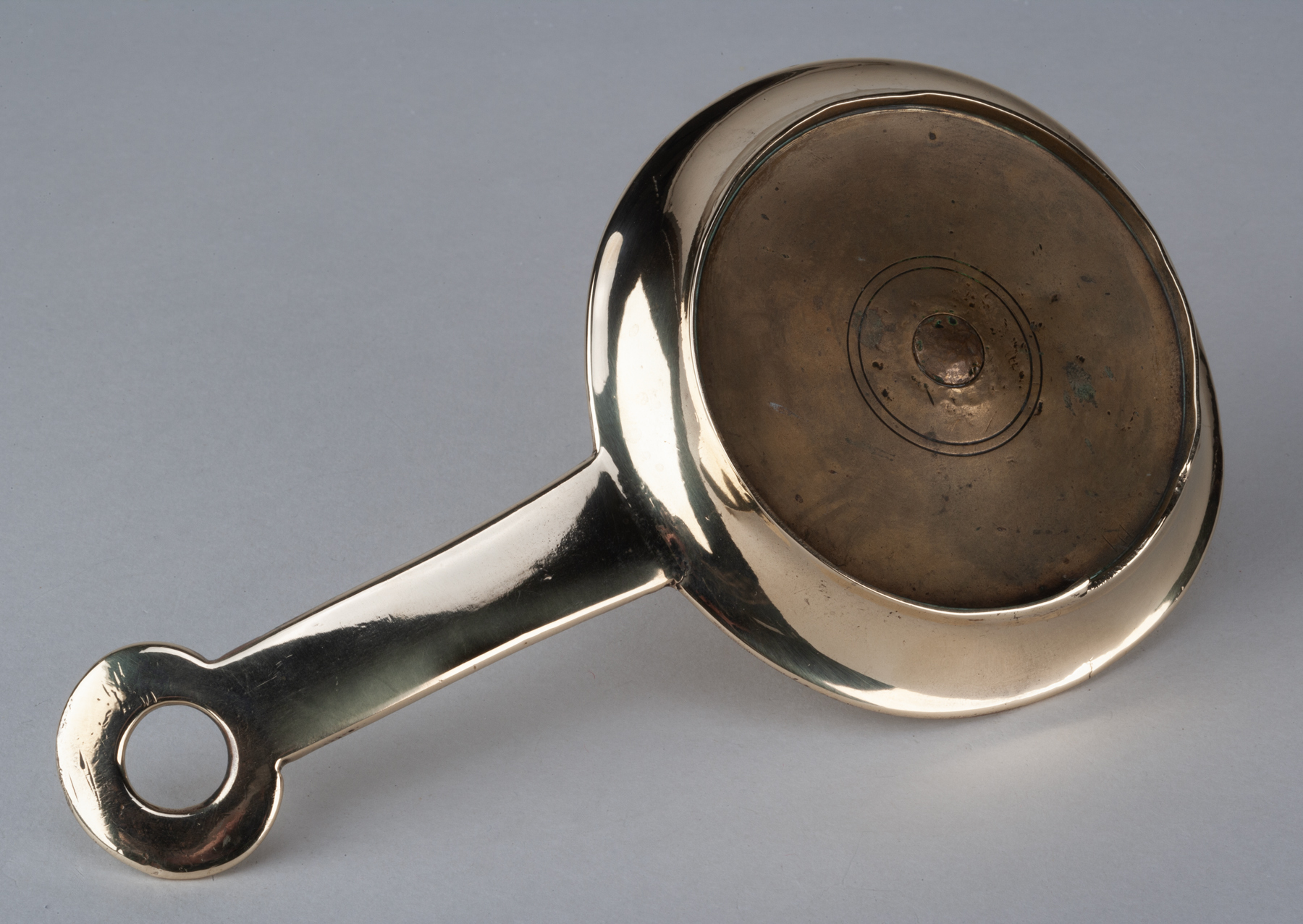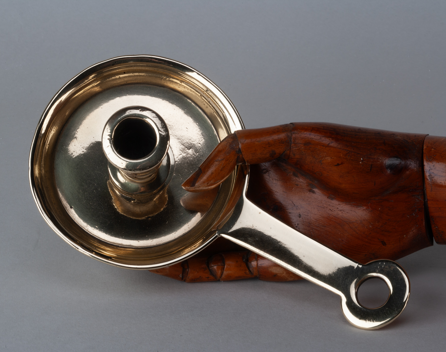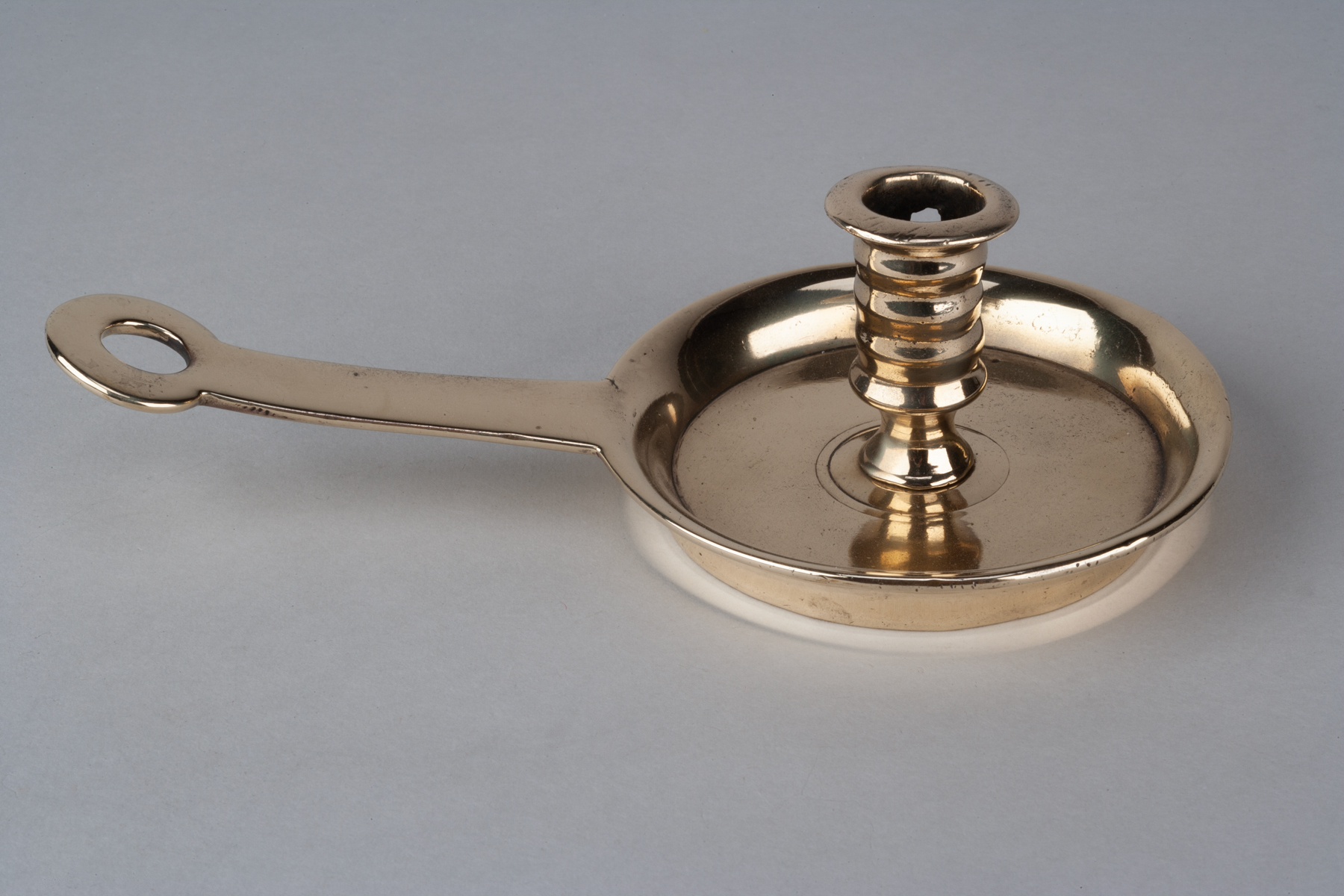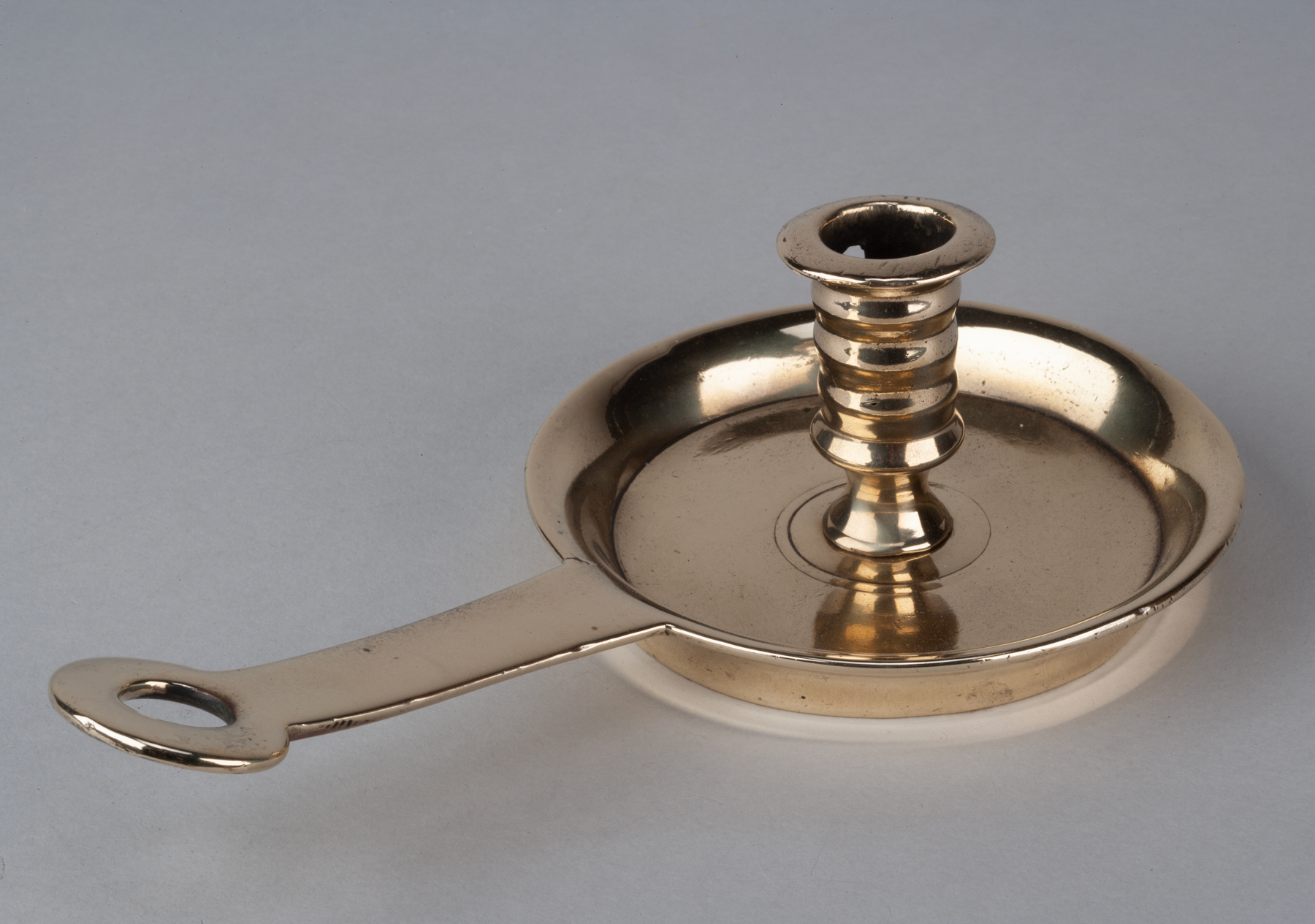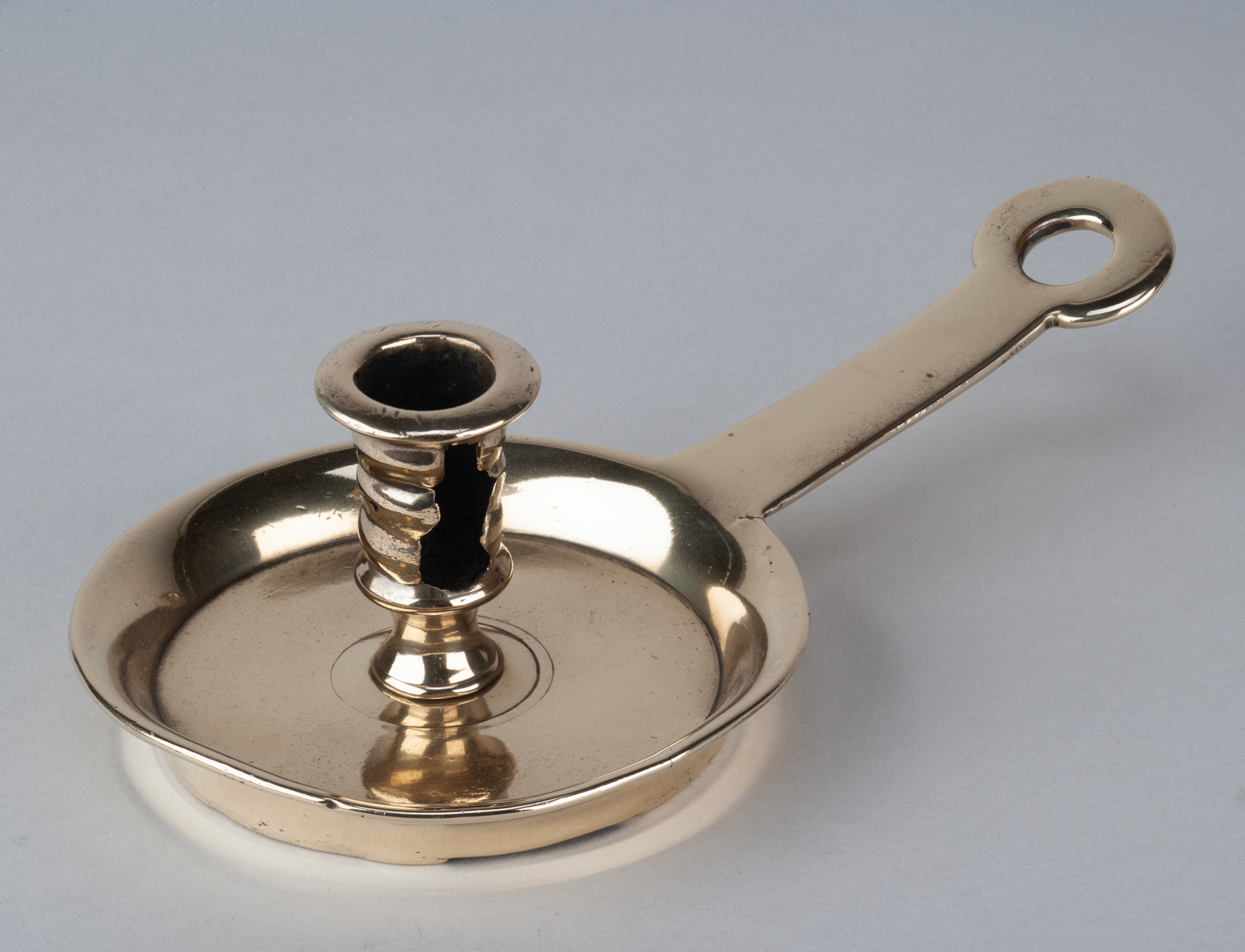 This fine and somehow charming example is cast, early, with a rippled socket reminiscent of an earlier trumpet-based candlestick. The casting of the socket thin on one side and now worn through and away leaving the thing to endure a large hole in its side. Furthermore, there is a piece of the foot rim broken way and lost.