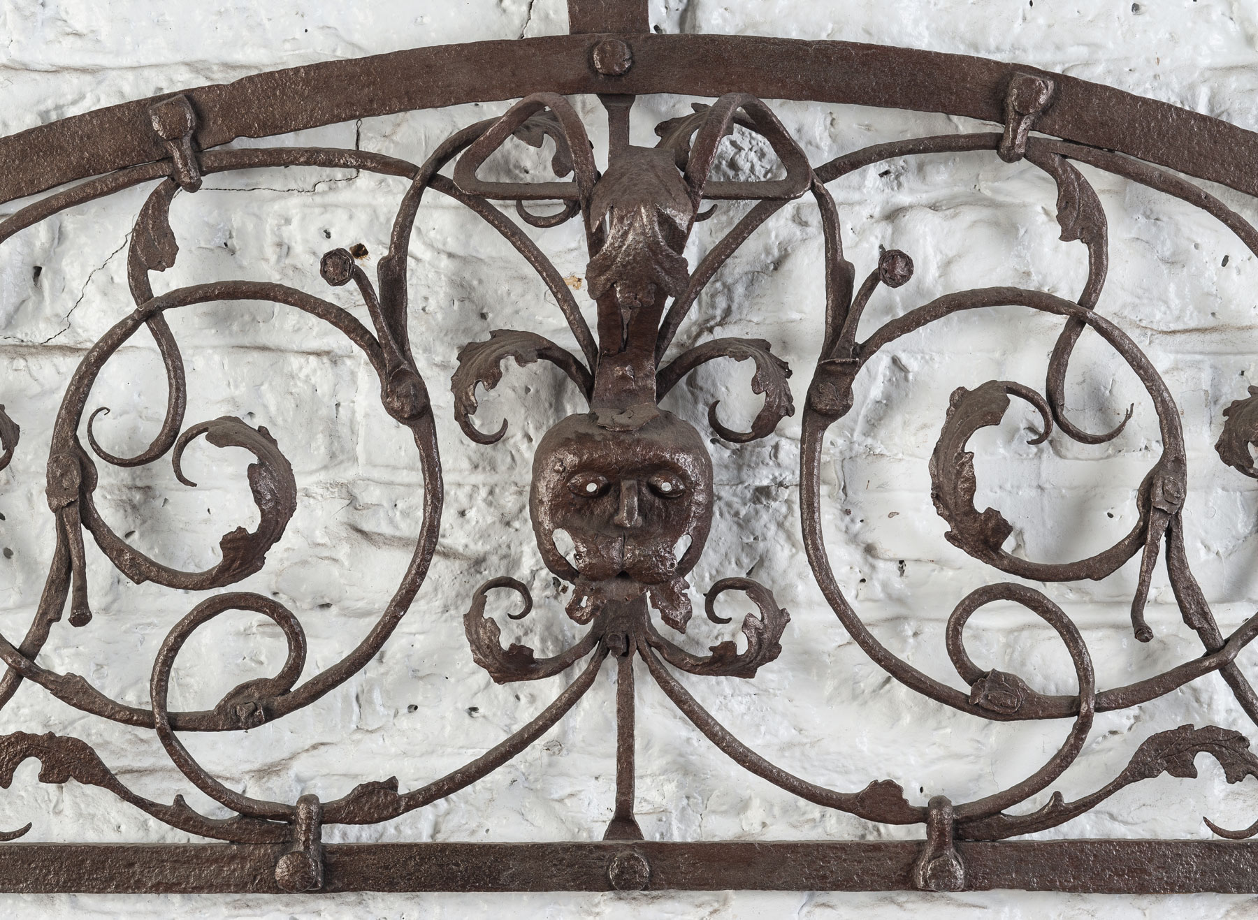 The Jessant-de-Lis is defined in heraldry as a leopard’s head amid a fleur-de-lis, the upper points arising from the top of the leopard’s head whilst the lower points emit from the mouth. This 17th century wrought iron lunette grille is made up of trailing leaves and flowers (all petals now rusted away) centred by a Jessant-de-Lis. The leopard’s head is the heraldic device of familiesAdy, Adry, Austie, Cantelow, Cooley, Dawbeney, Leversedge, Prestwick, Tension and Watkins, and as such may be from the family house of any one.