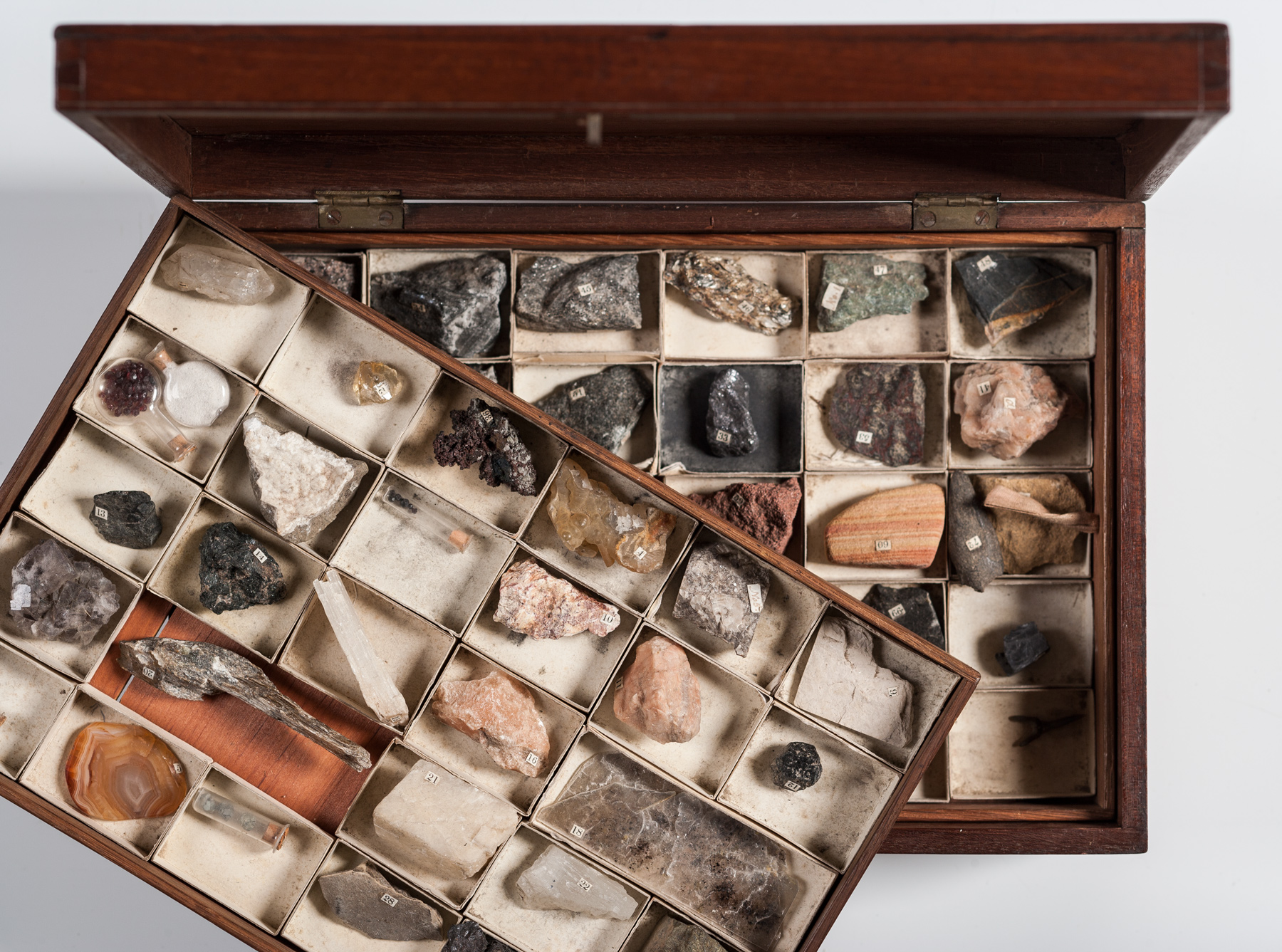 A mahogany boxed collection of minerals over three lift-out trays, mostly numbered, together with a hand written ‚’Catalogue of a Small Collection of Minerals and Geological Specimens arranged and sold by James Tennant, No.149 Strand, London. April 1844′.