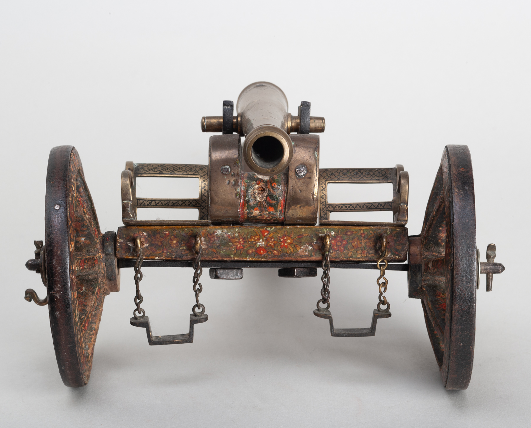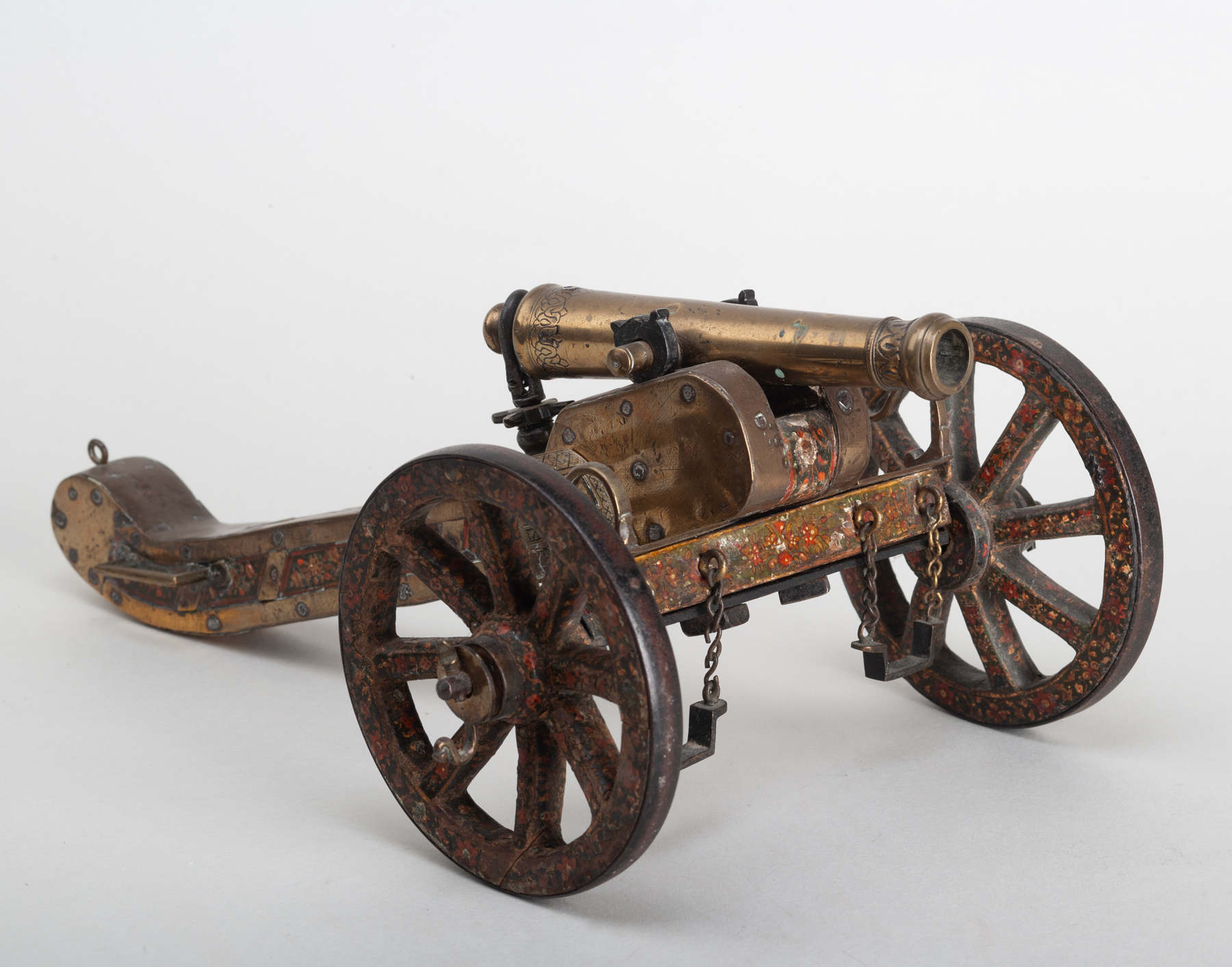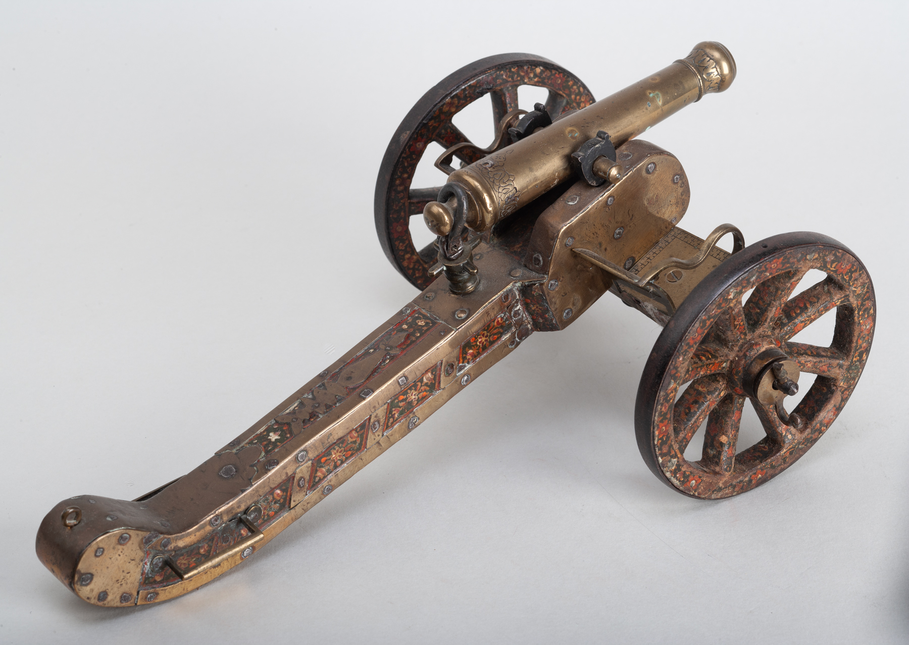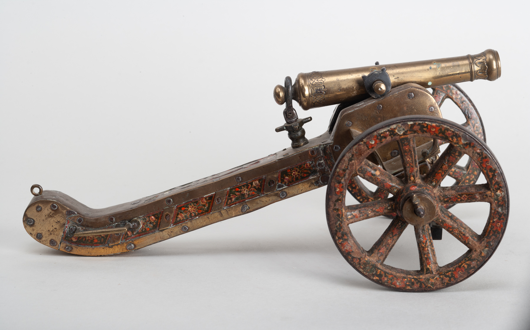 A live model of a British Indian Army cannon, the barrel engraved and set upon a wooden carriage clad in brass pinned with steel and painted all over.