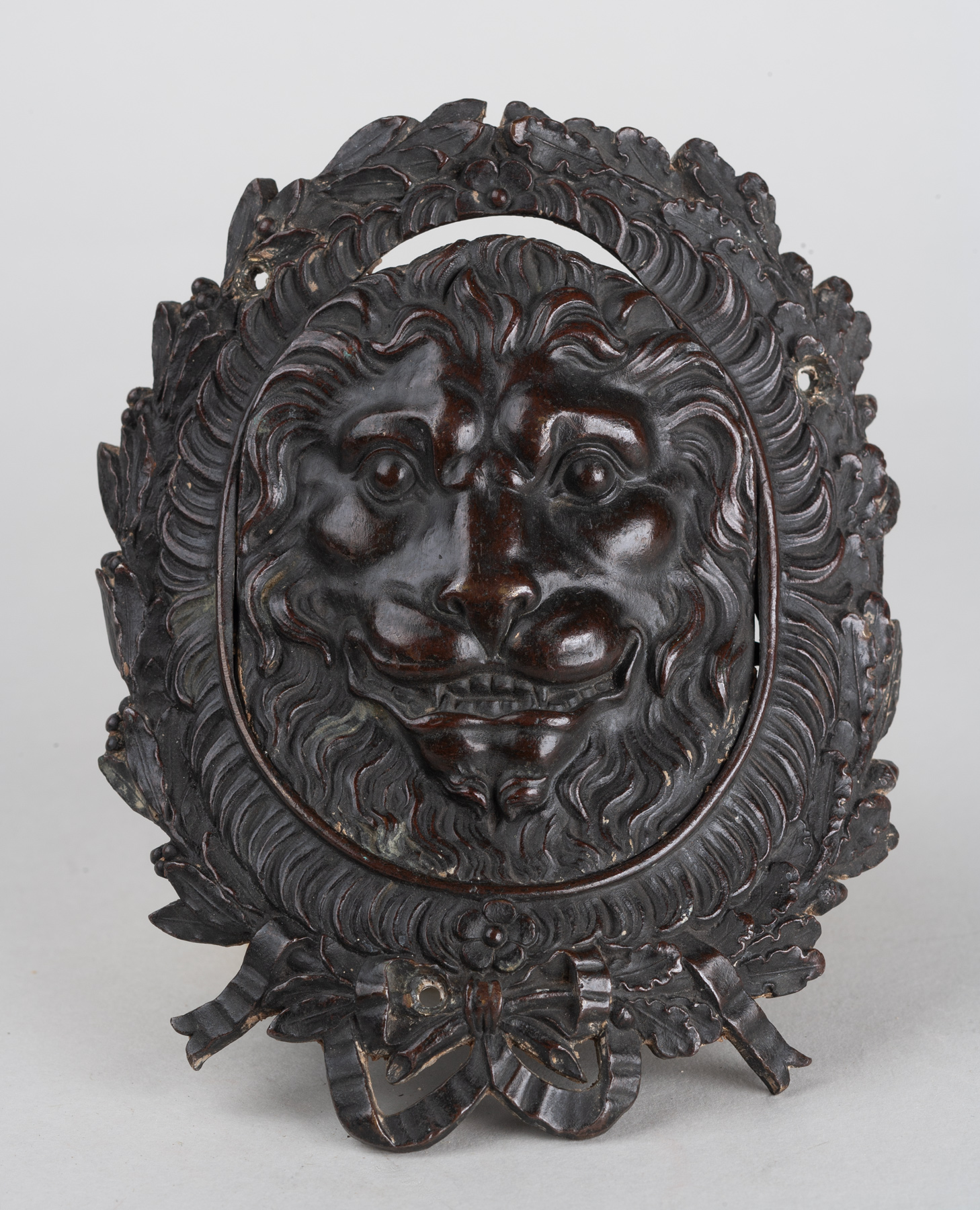 A lion’s mask that pivots in a frame of mane and ribbon-tied laurel.