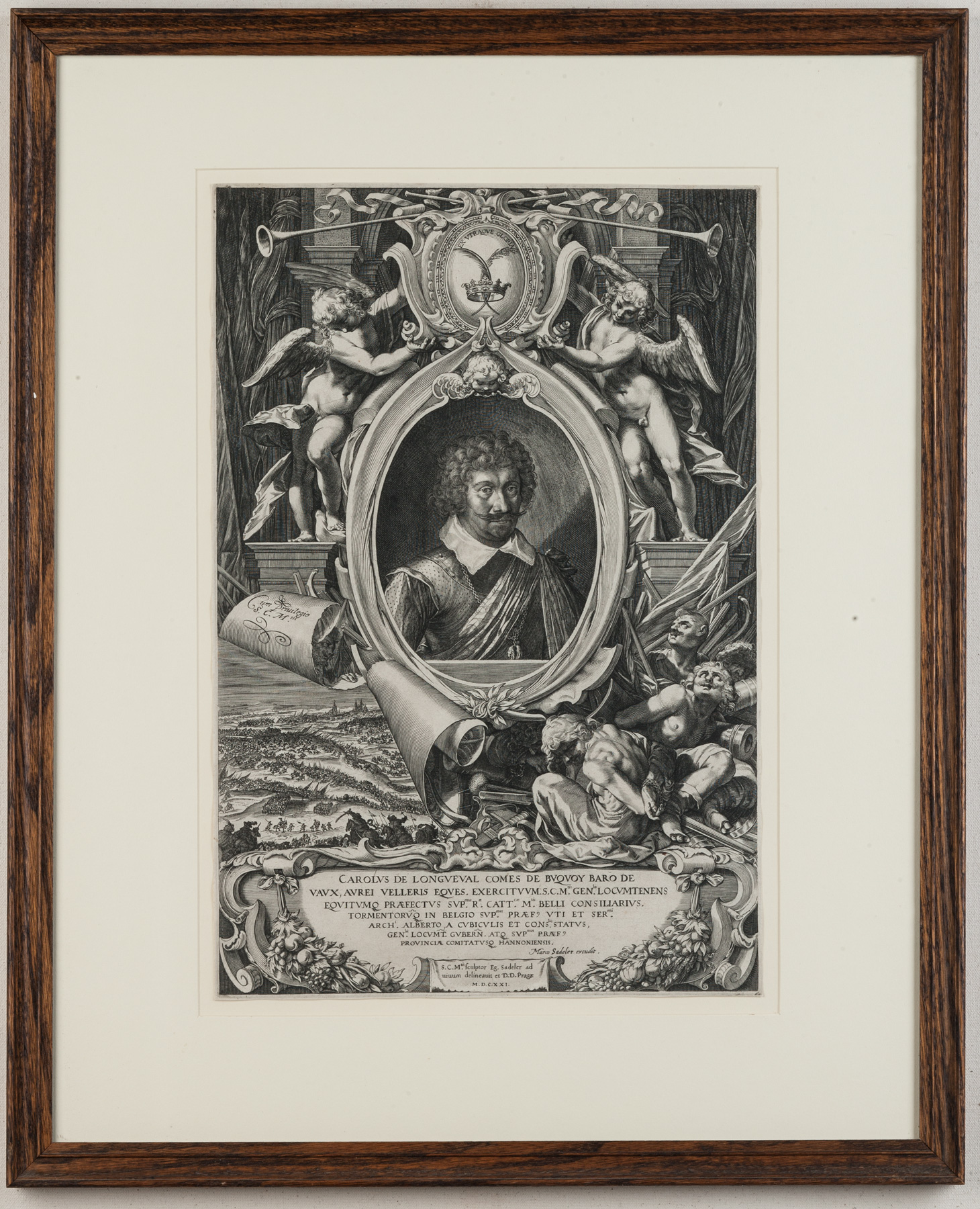 The Sadeler family were the largest, and probably the most successful of the dynasties of Flemish engravers of the 17th century. They were descended from “chasers,” engravers of armour, from Aalst. Sadeler was the imperial artist to the Austrian Hapsburg court in the seventeenth century. He recorded many of the various rulers and noblemen who visited Emperor Rudolf II and engraved their portraits, usually in an emblematic oval surrounded by mythical symbols and intricate images of battle scenes, here a battle during the Thirty Years’ War, that served to heighten the sitter’s importance.