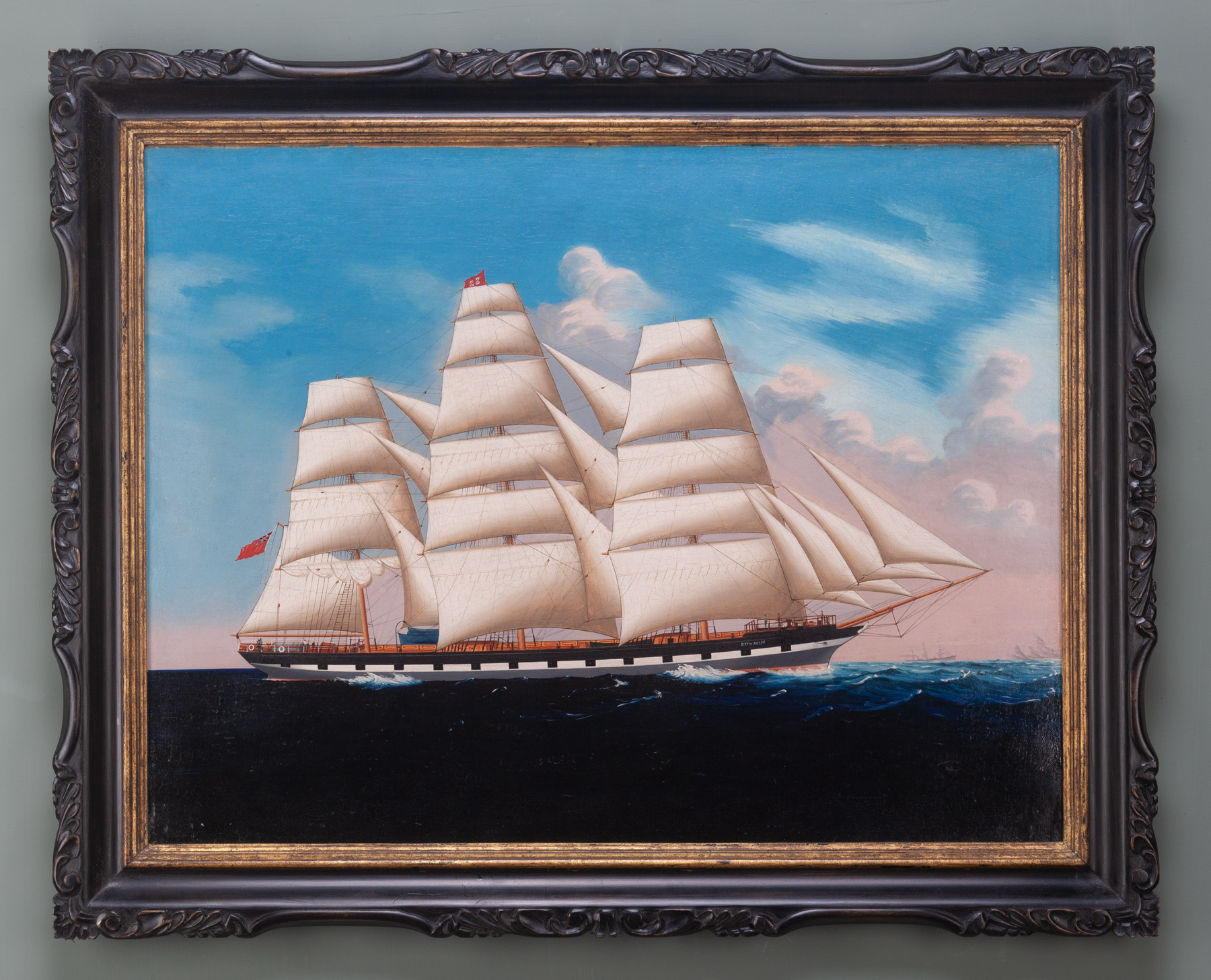 The ship City of Delhi in The China Seas, painted by a Chinese artist. Within a fine modern replica of a carved Chinese ‘Chippendale’ frame. The painting Chinese, circa 1860.