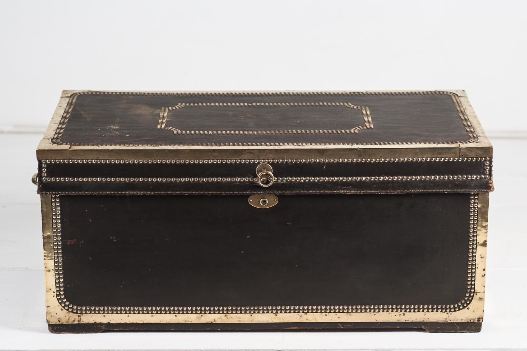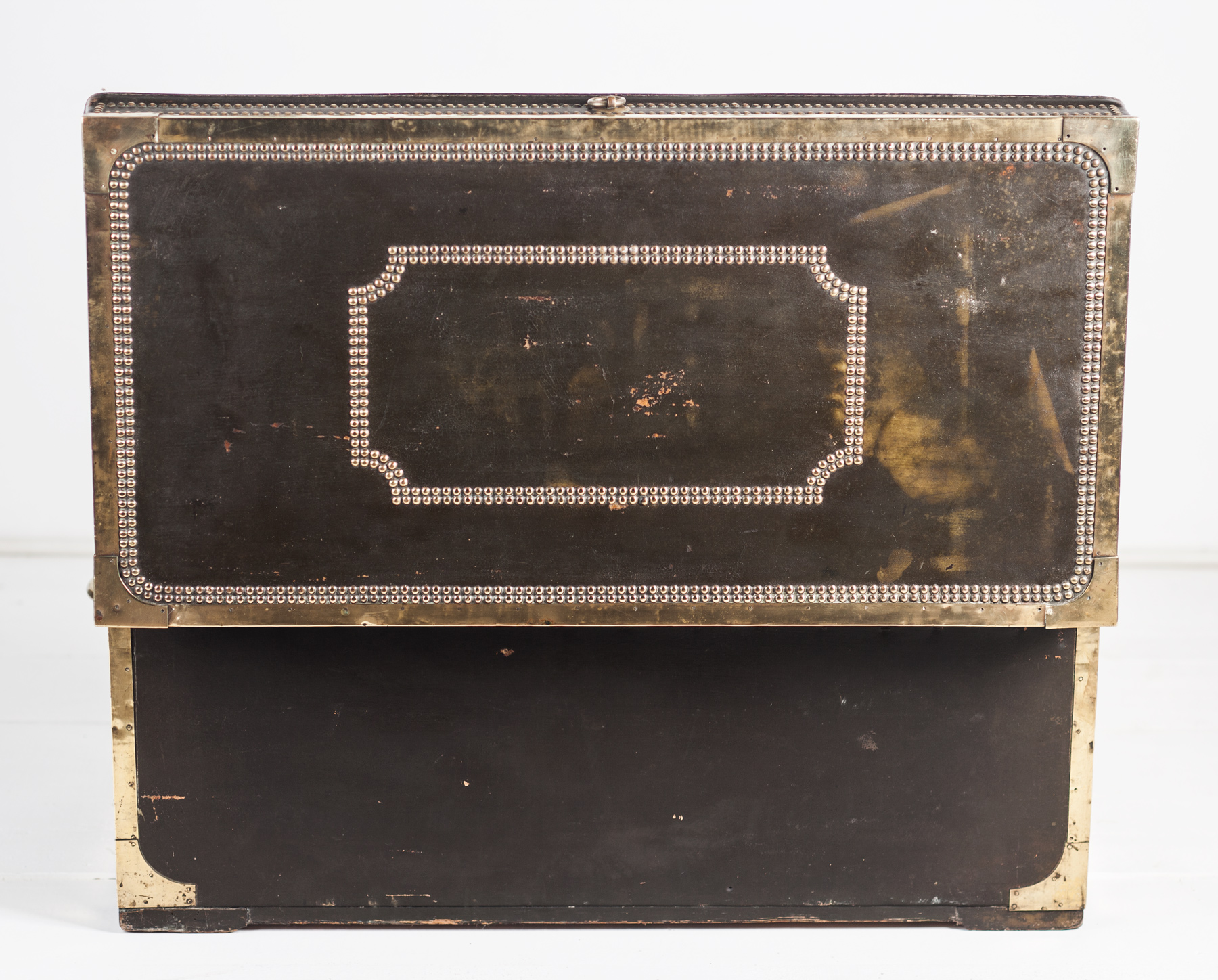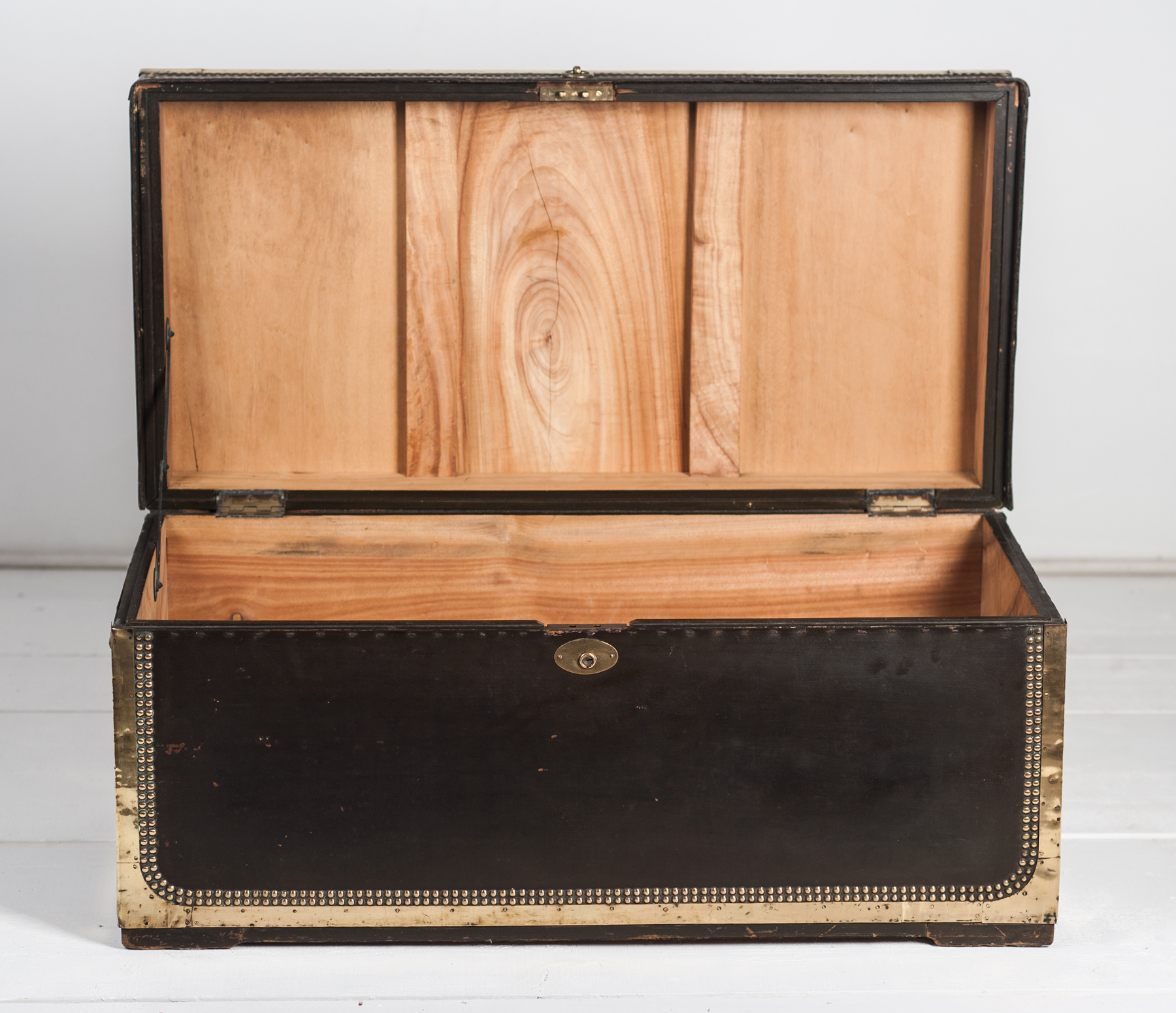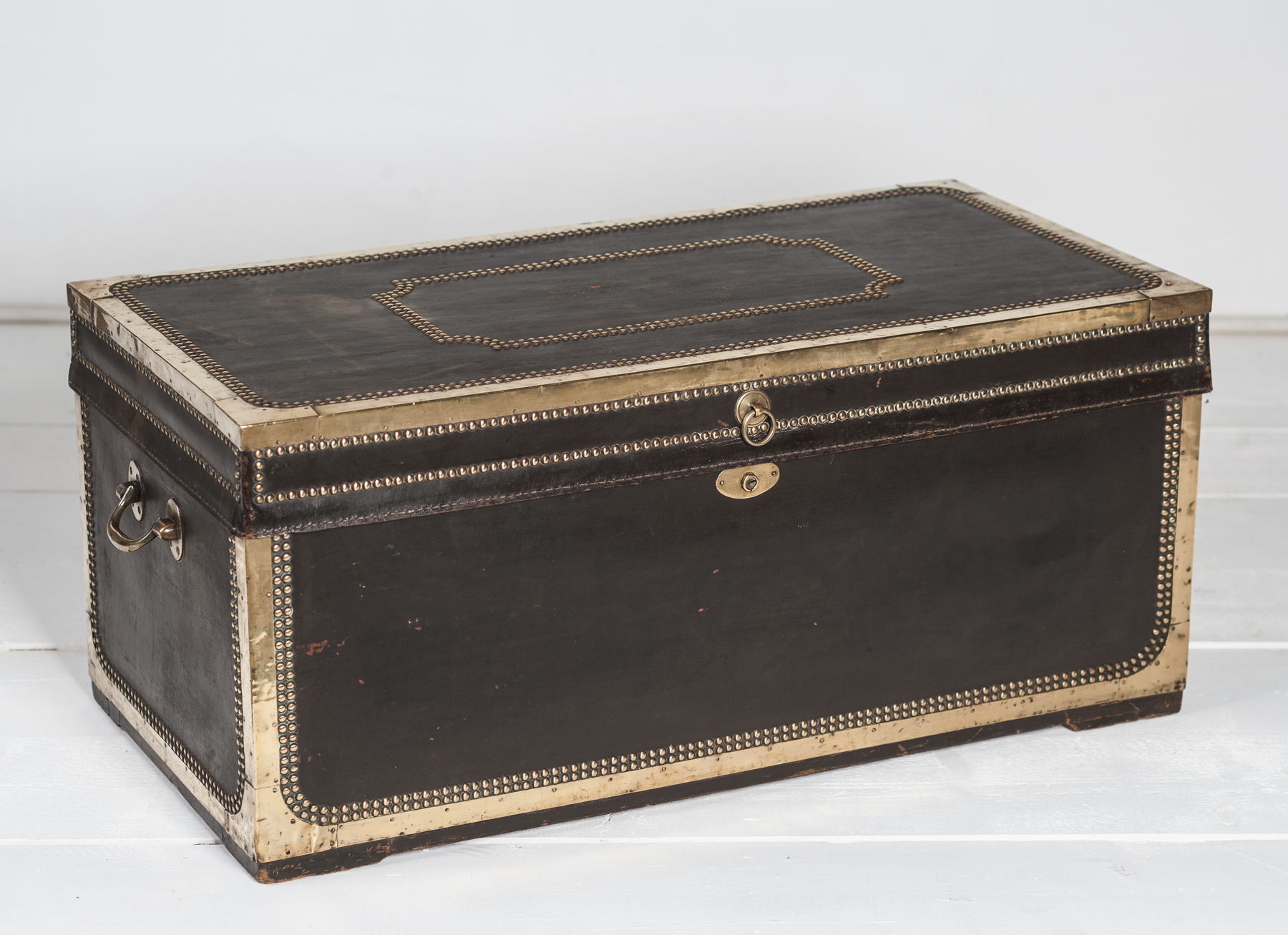 A large China Trade travelling trunk, black leather over solid camphorwood, brass edged and double studded.