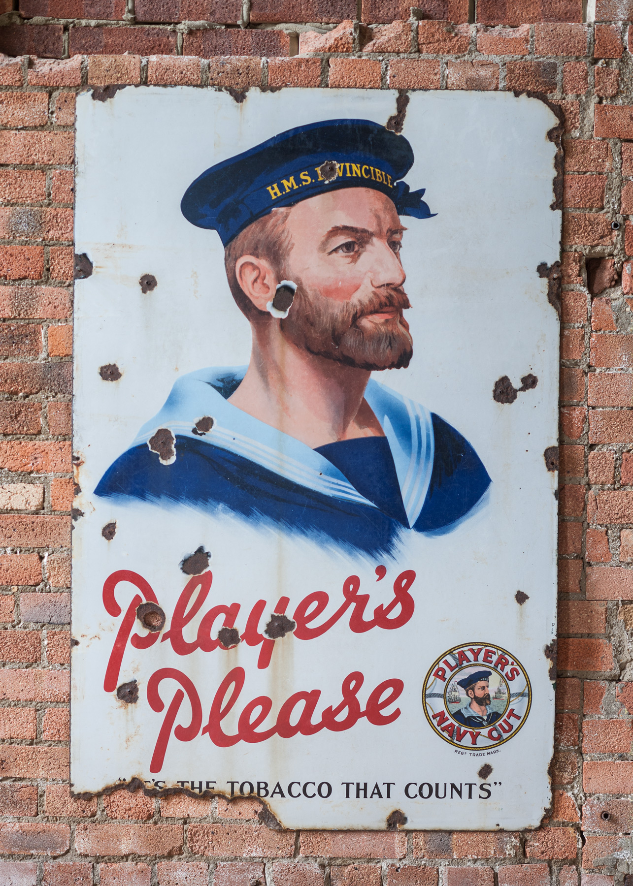 Having bought the portrait, John Player took the sailor’s head and used it as the logo for his prosperous company producing cigarettes and rolling tobacco. By 1891 this original painting was effectively no more, Player having added a life belt in 1888 and two ships in 1891; H.M.S Britannia and H.M.S. Hero. The resulting image retained as the REGd. TRADE MARK in this enamel sign.