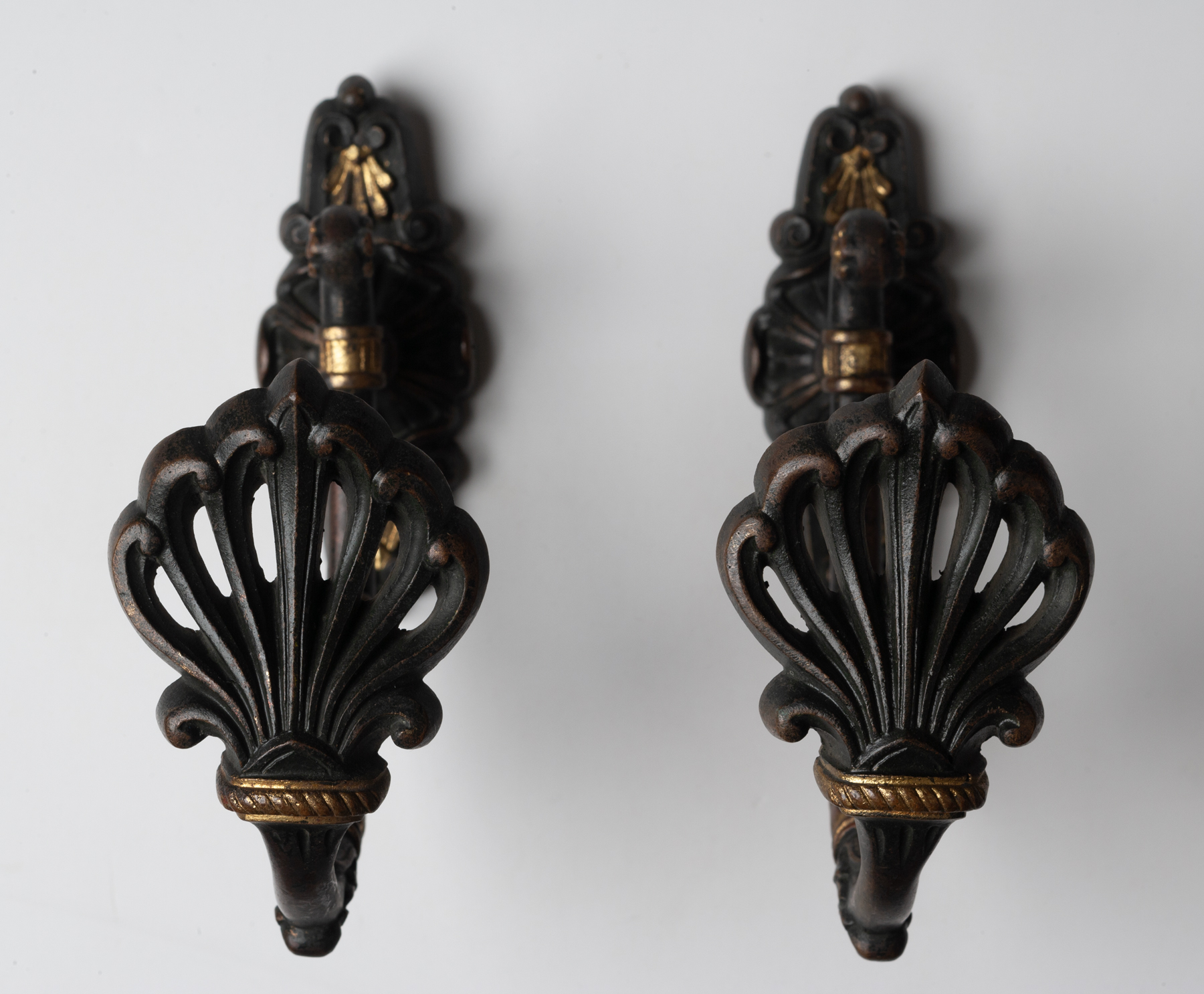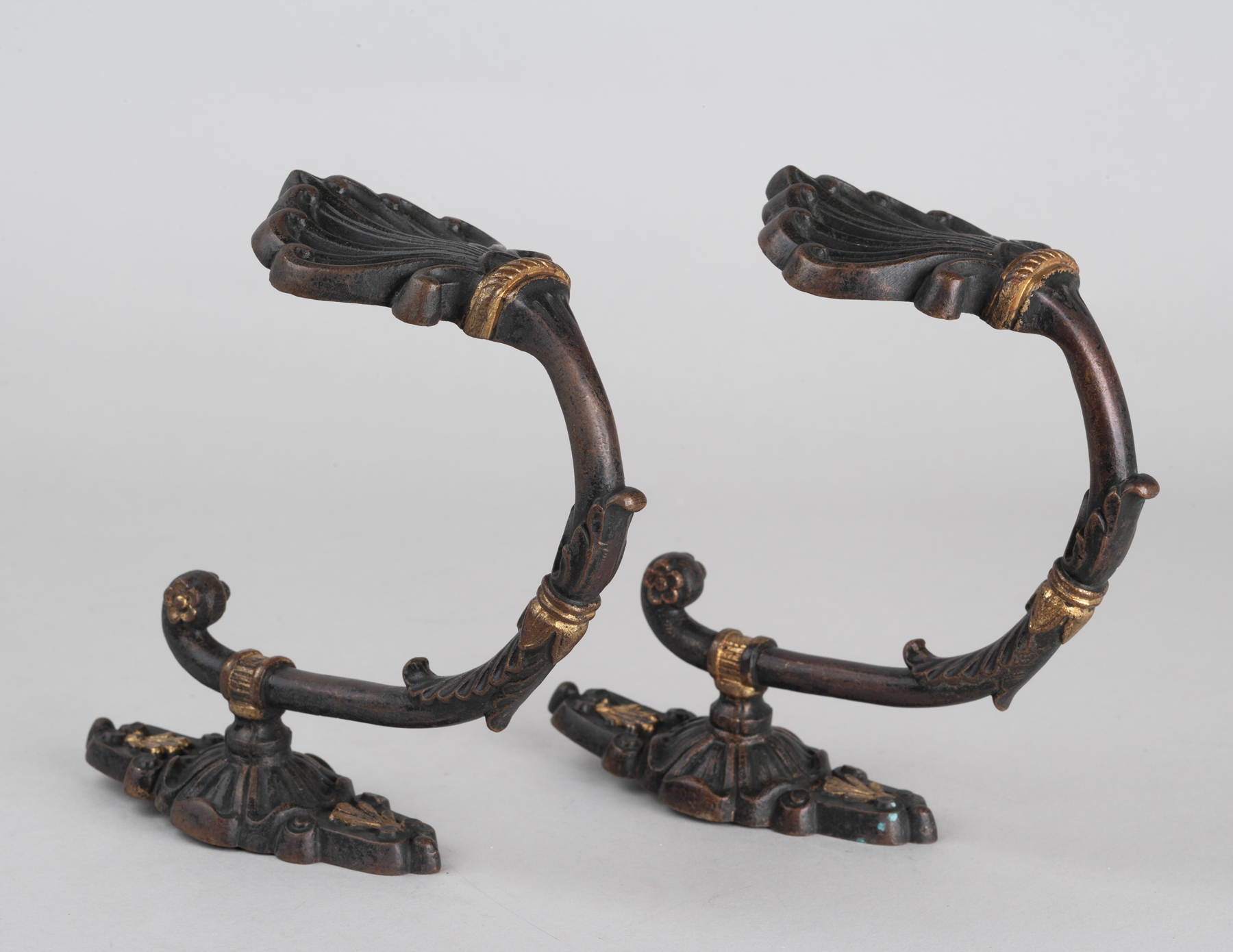 A pair of French, parcel-gilt bronze curtain ties with honeysuckle terminals.