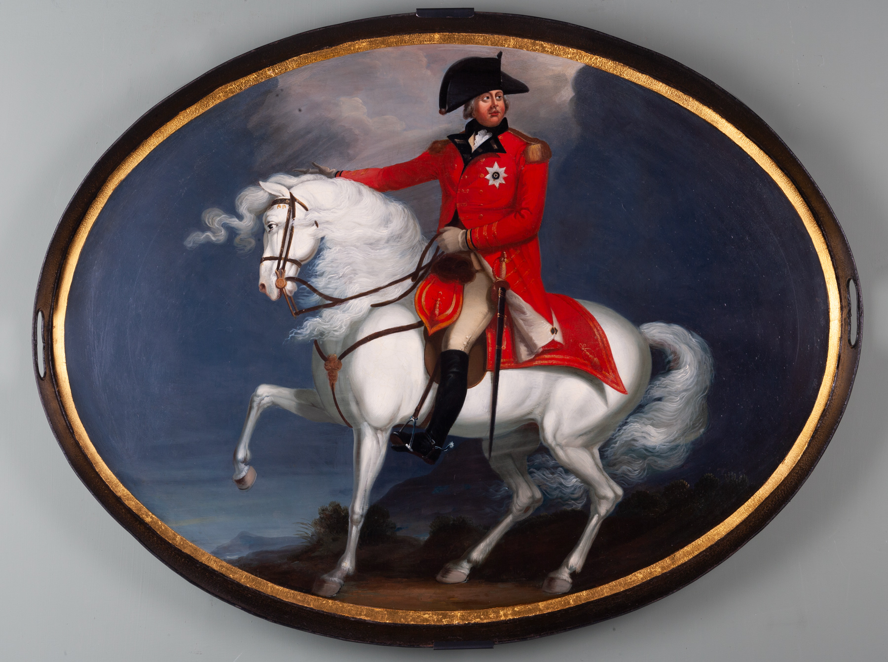A fabulous painted metal tray; King George III on his favourite charger, Adonis.