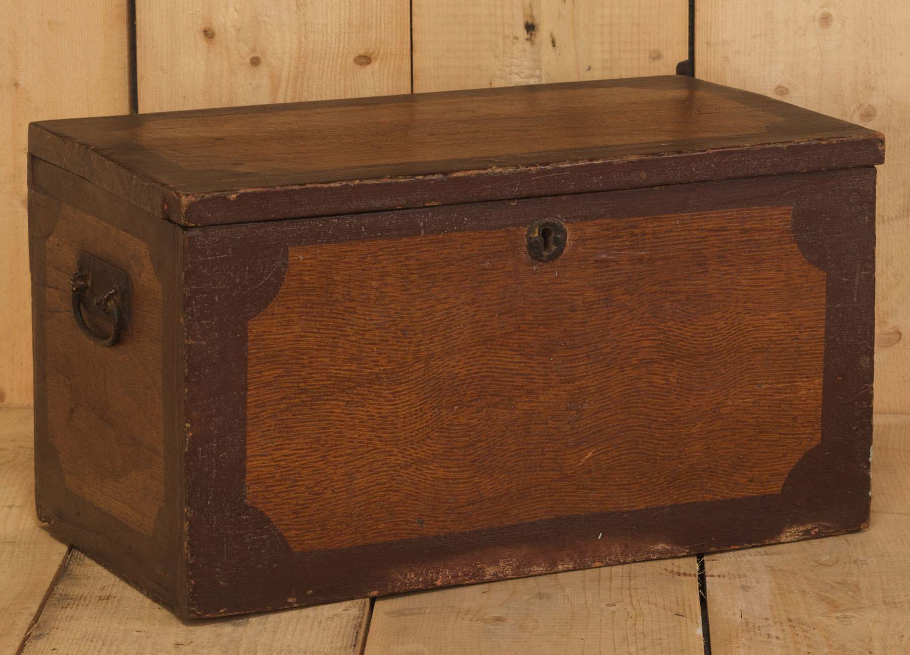 A small pine trunk with iron carrying handles, grained to simulate oak and mahogany and with the original blue paper lining.English circa mid 19th century.