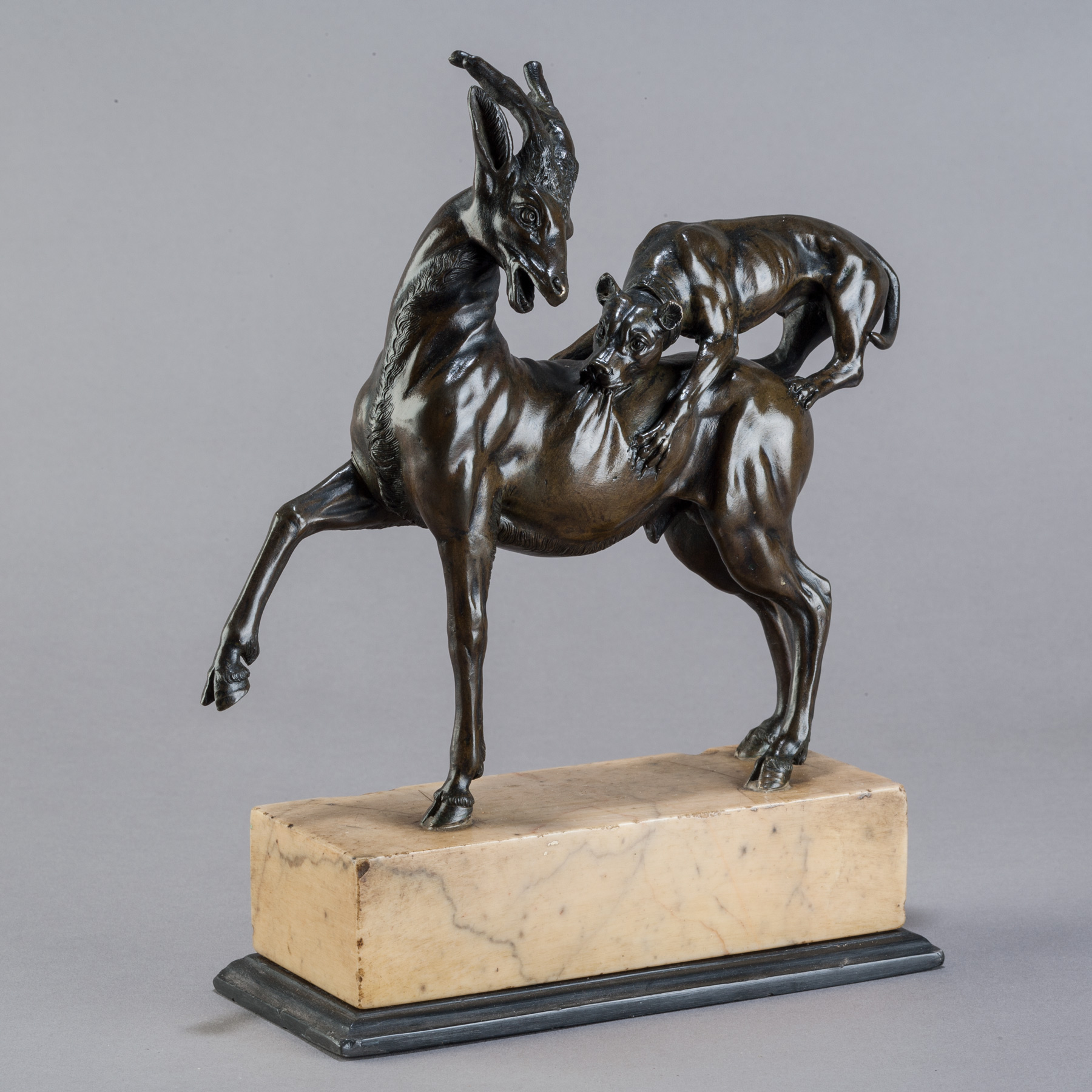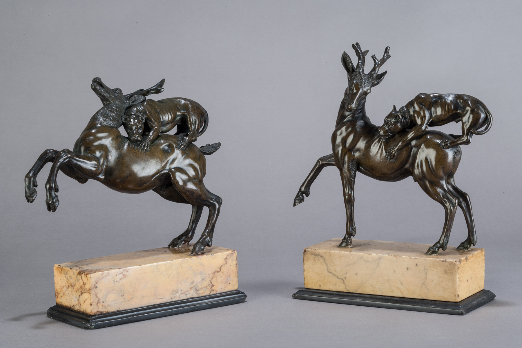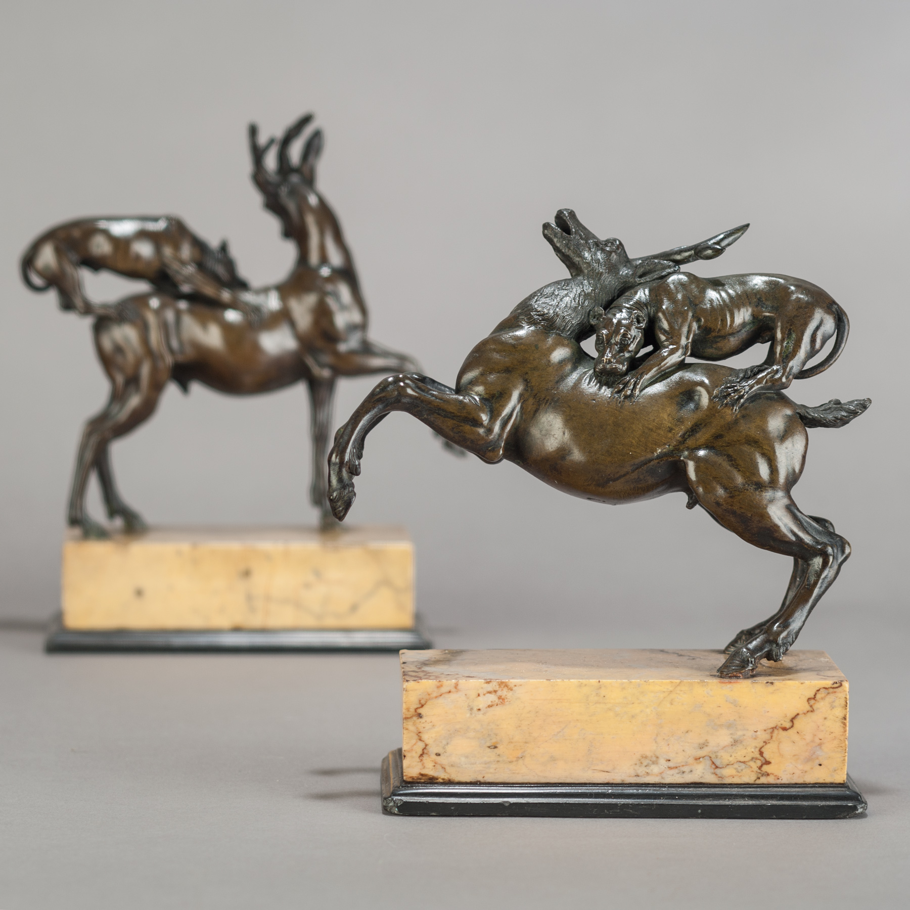 A pair of Roman bronze statuettes of mastiffs attacking stags, after the antique.