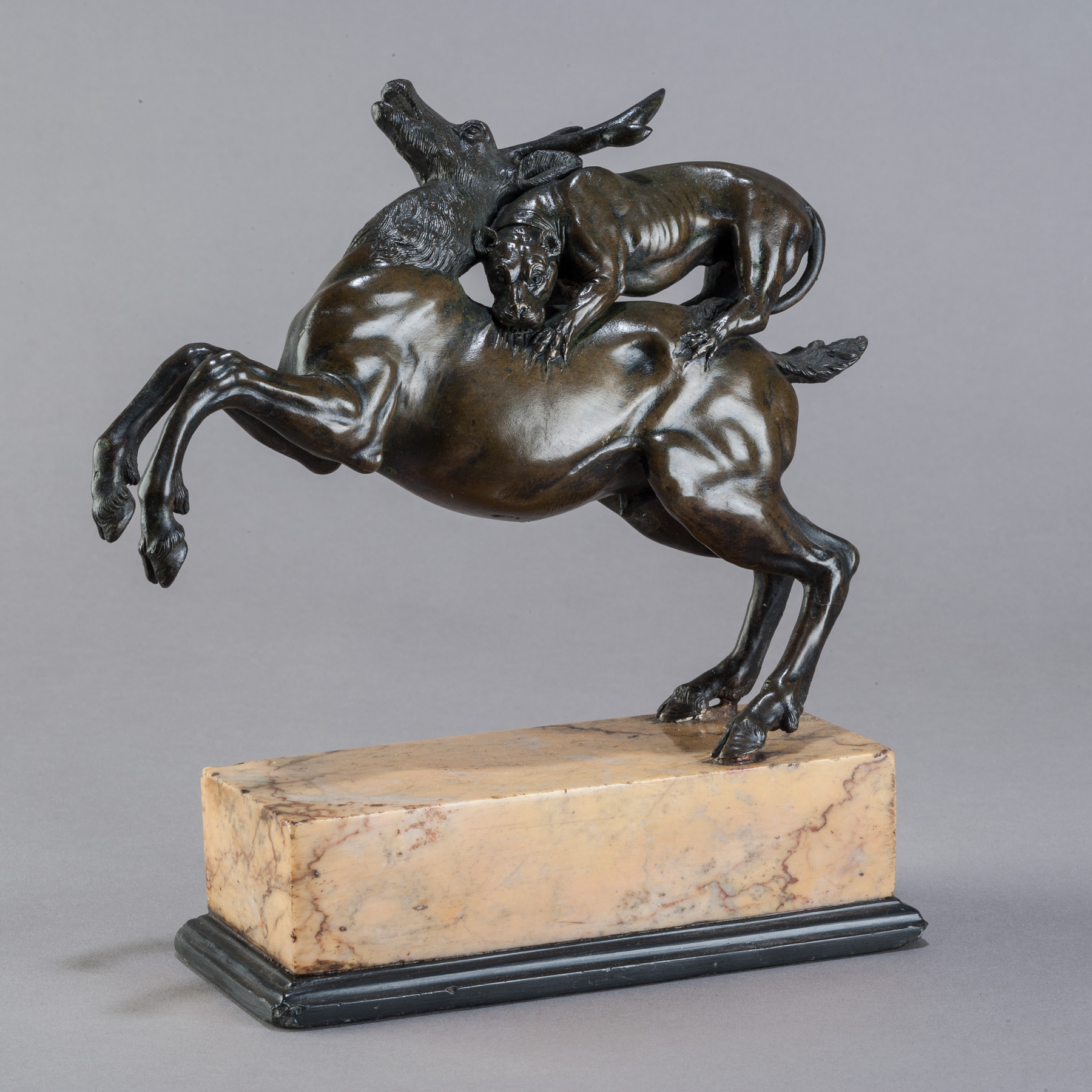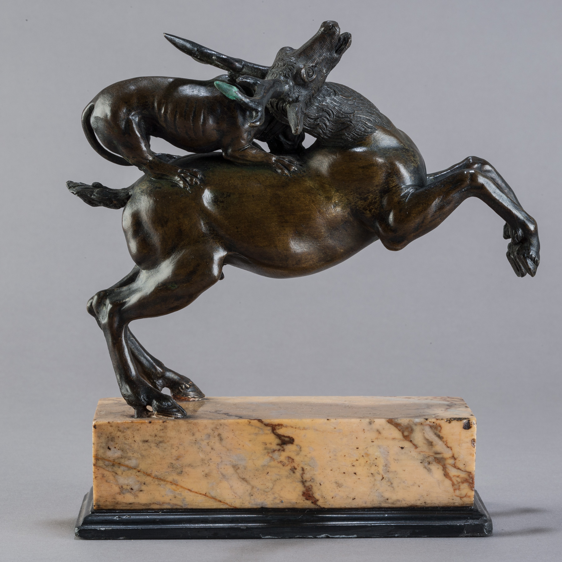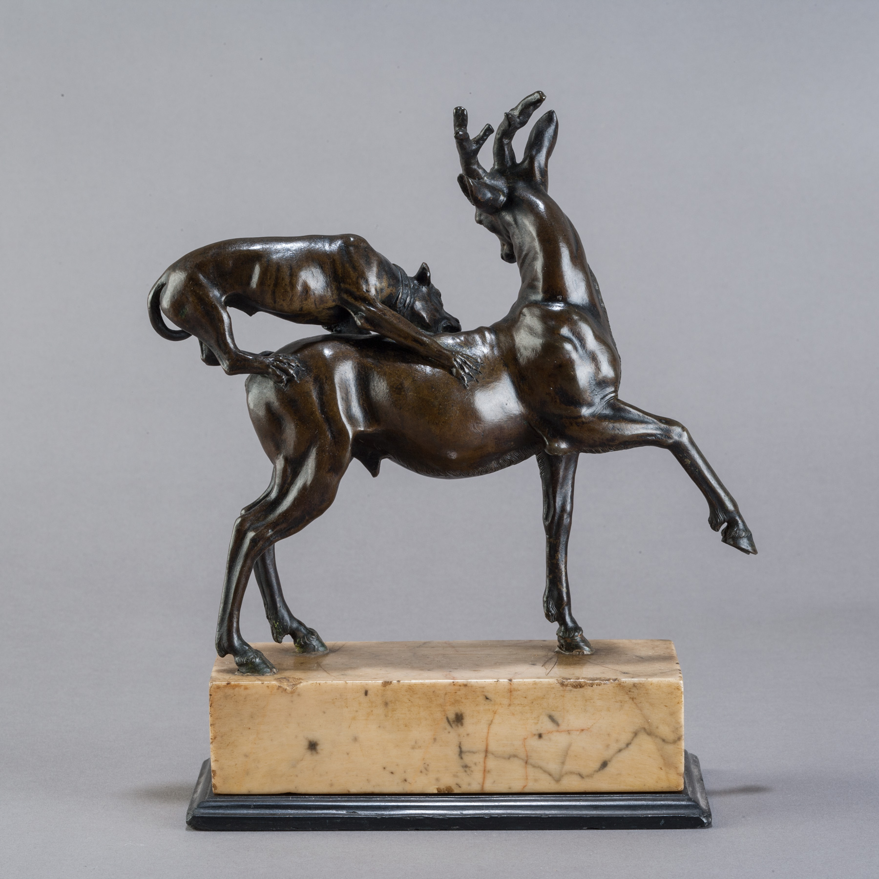 A pair of Roman bronze statuettes of mastiffs attacking stags, after the antique.