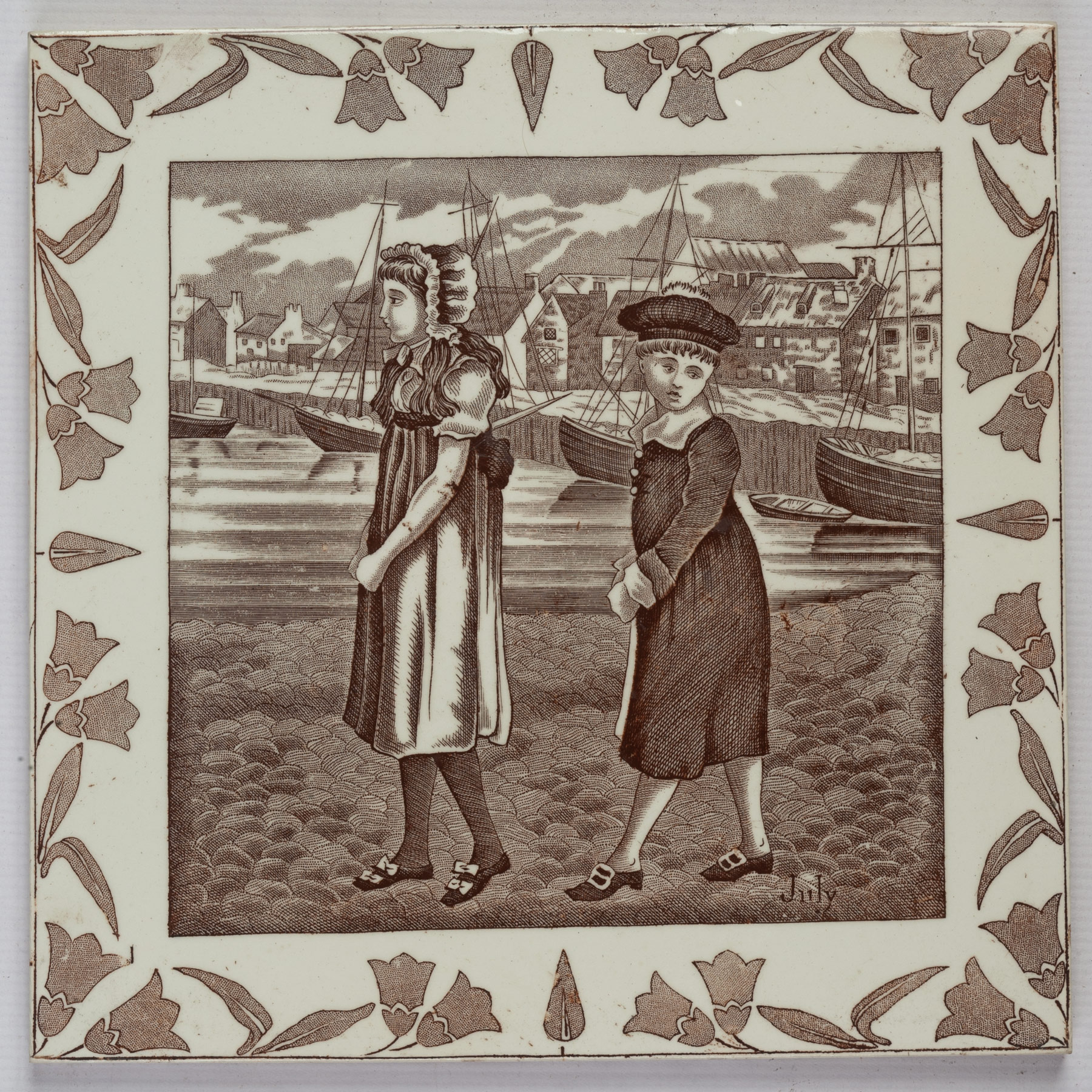 Designed by Helen Miles for Wedgwood and registered in 1878, one of twelve month tiles, this example “July”, in the larger 8 inch version with a Bell Flower border.