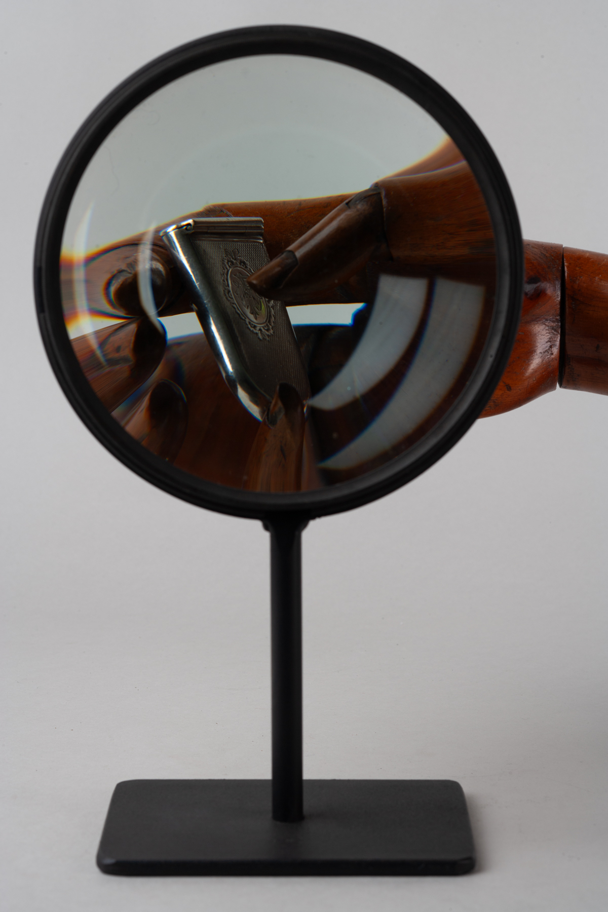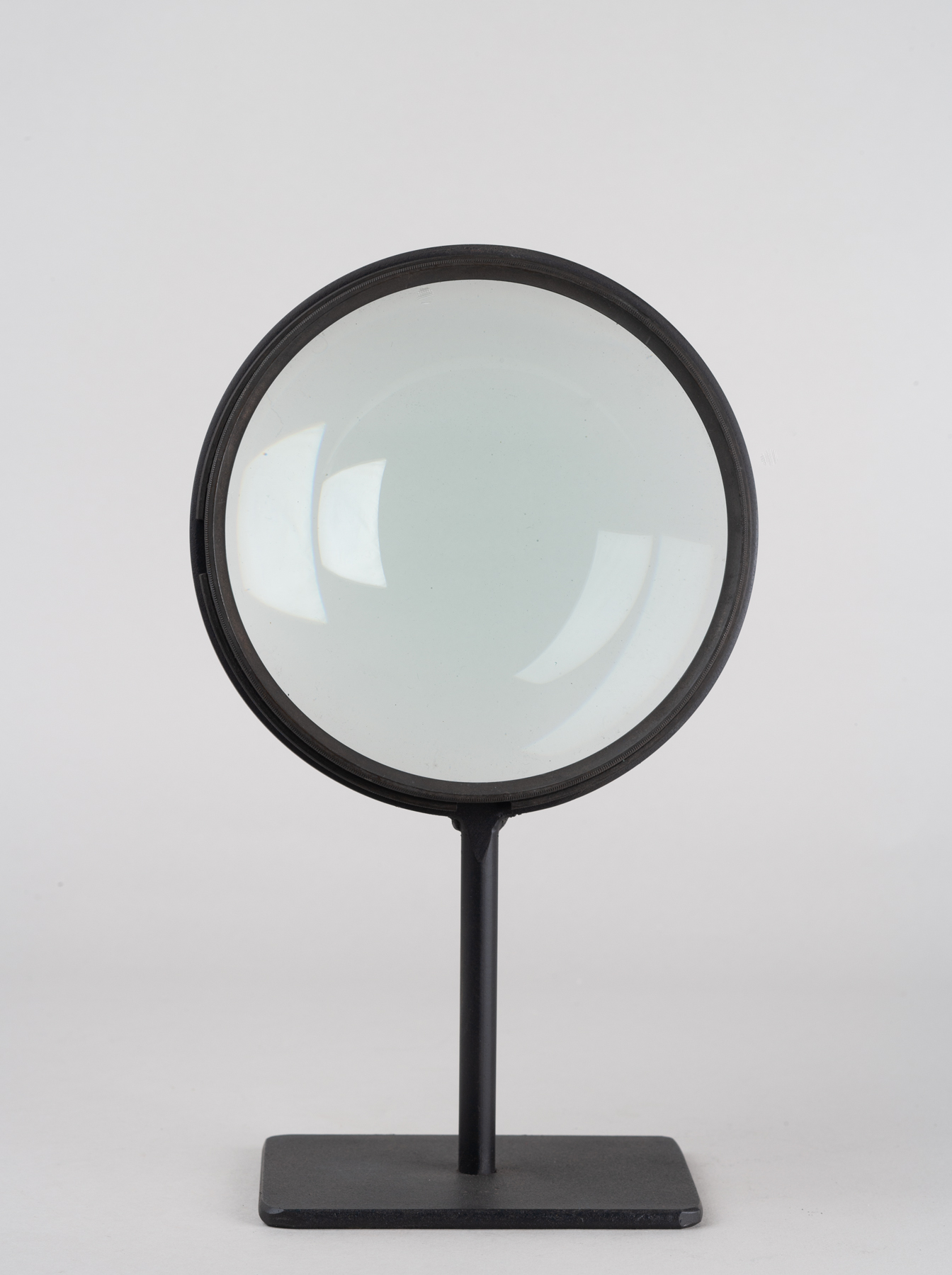 A large lens saved from a Victorian Magic Lantern, mounted onto an iron base.