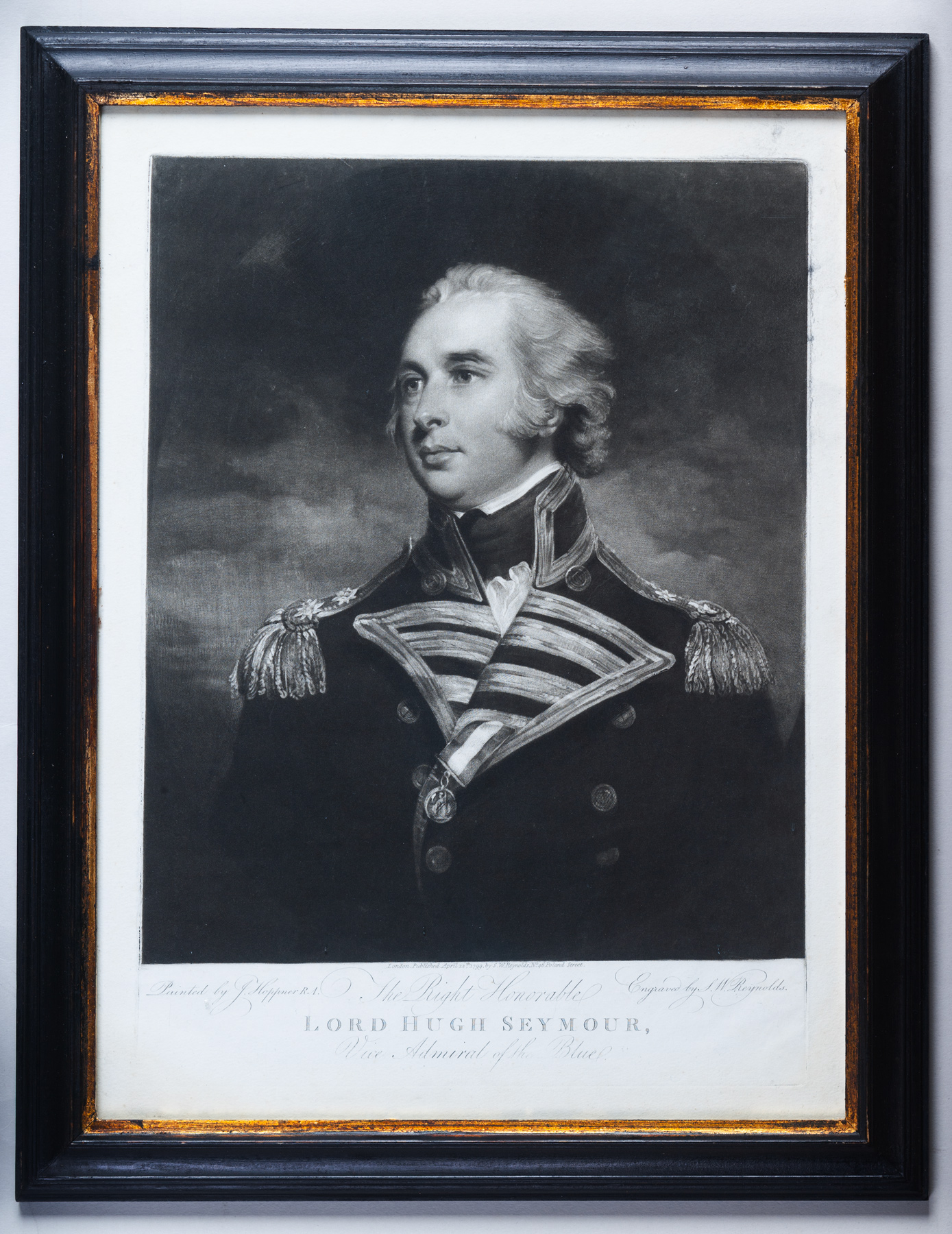 An excellent mezzotint portrait of Vice Admiral of the Blue, Lord Hugh Seymour. Engraved by Samuel William Reynolds after the painting by John Hoppner; published in 1799 by Reynolds from No. 46 Poland Street, London.