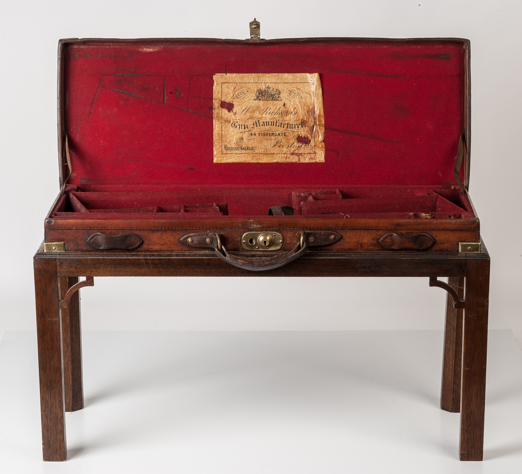 A gun case for a pair of shotguns, best quality tan leather with solid brass corners for protection in carriage.