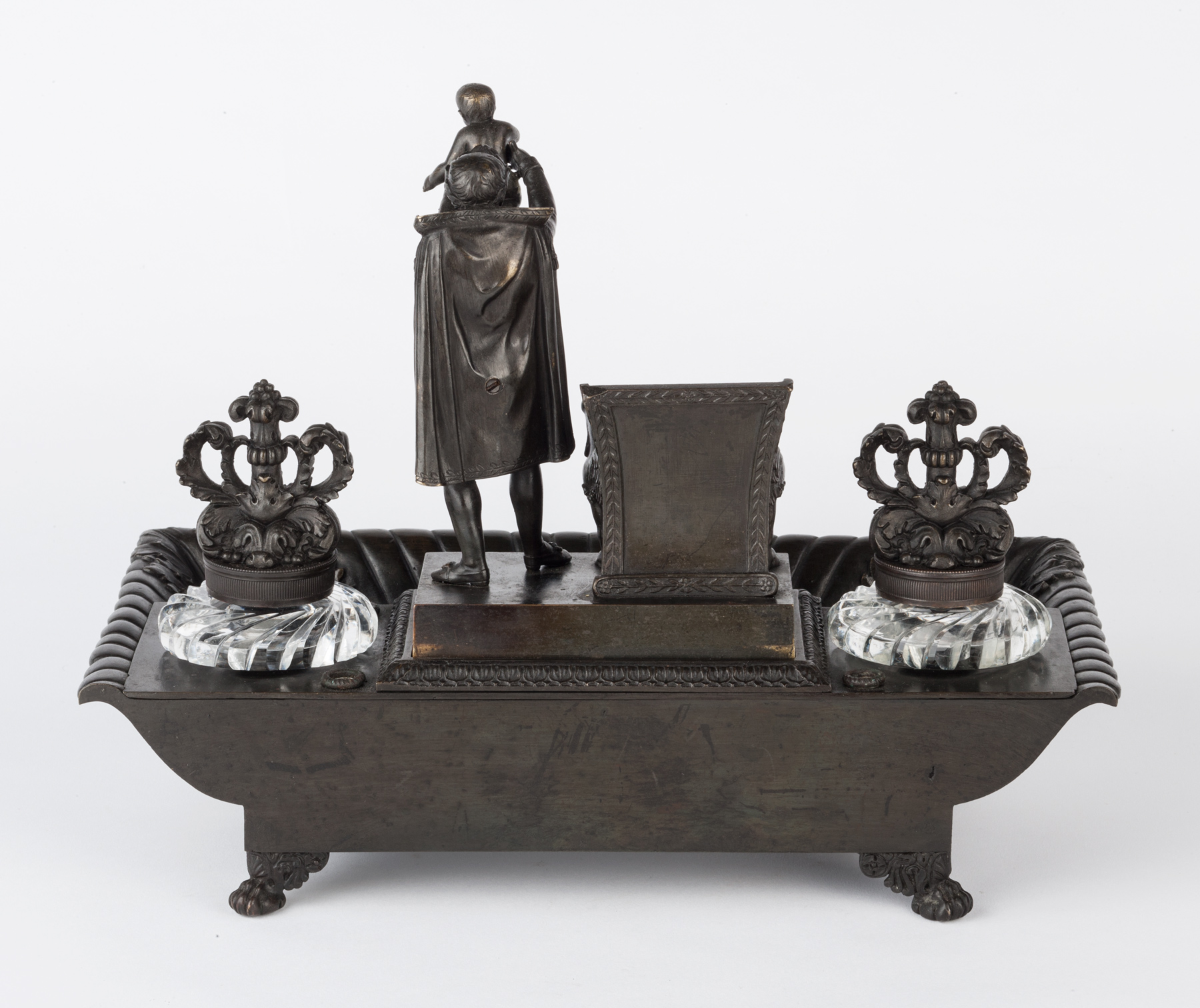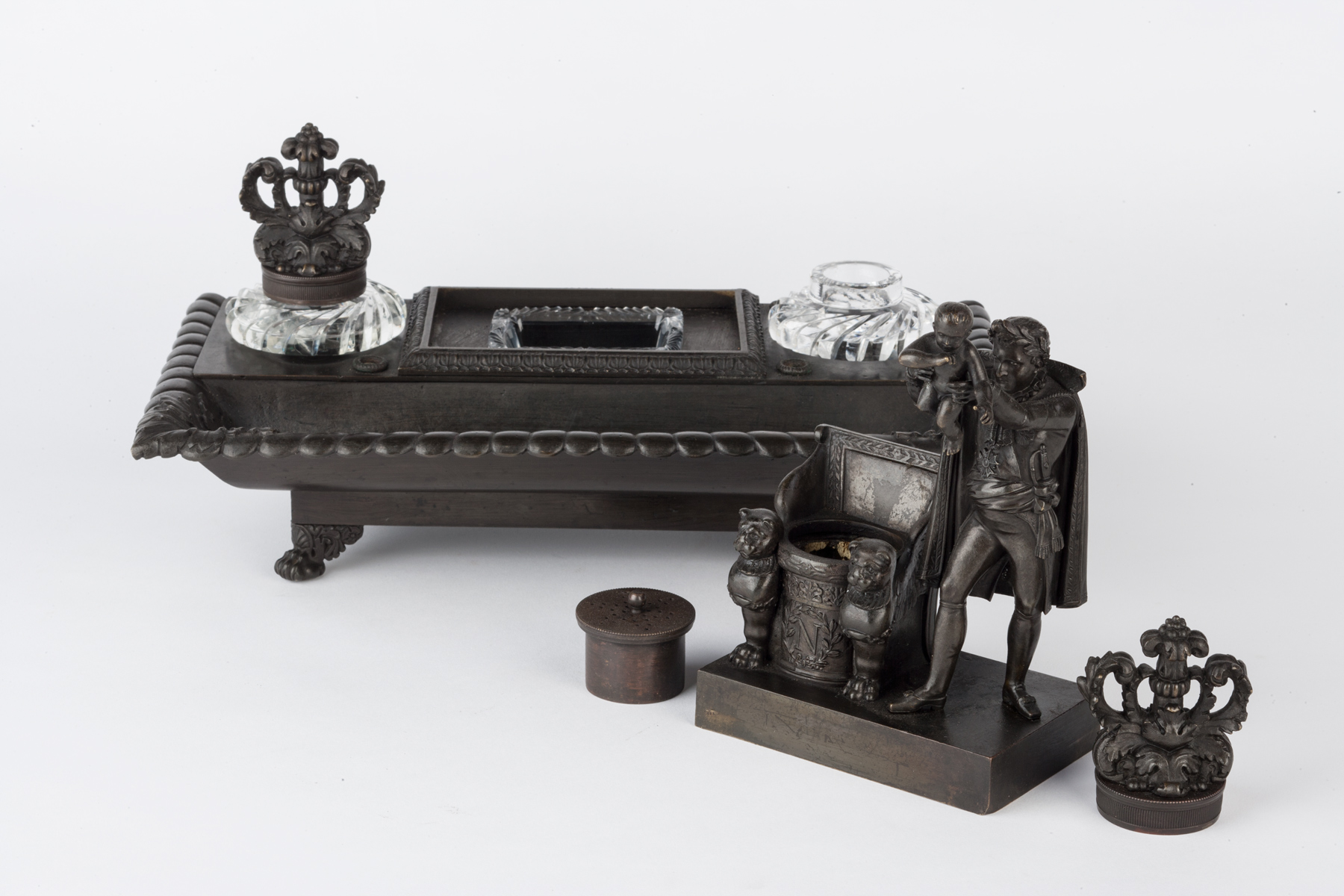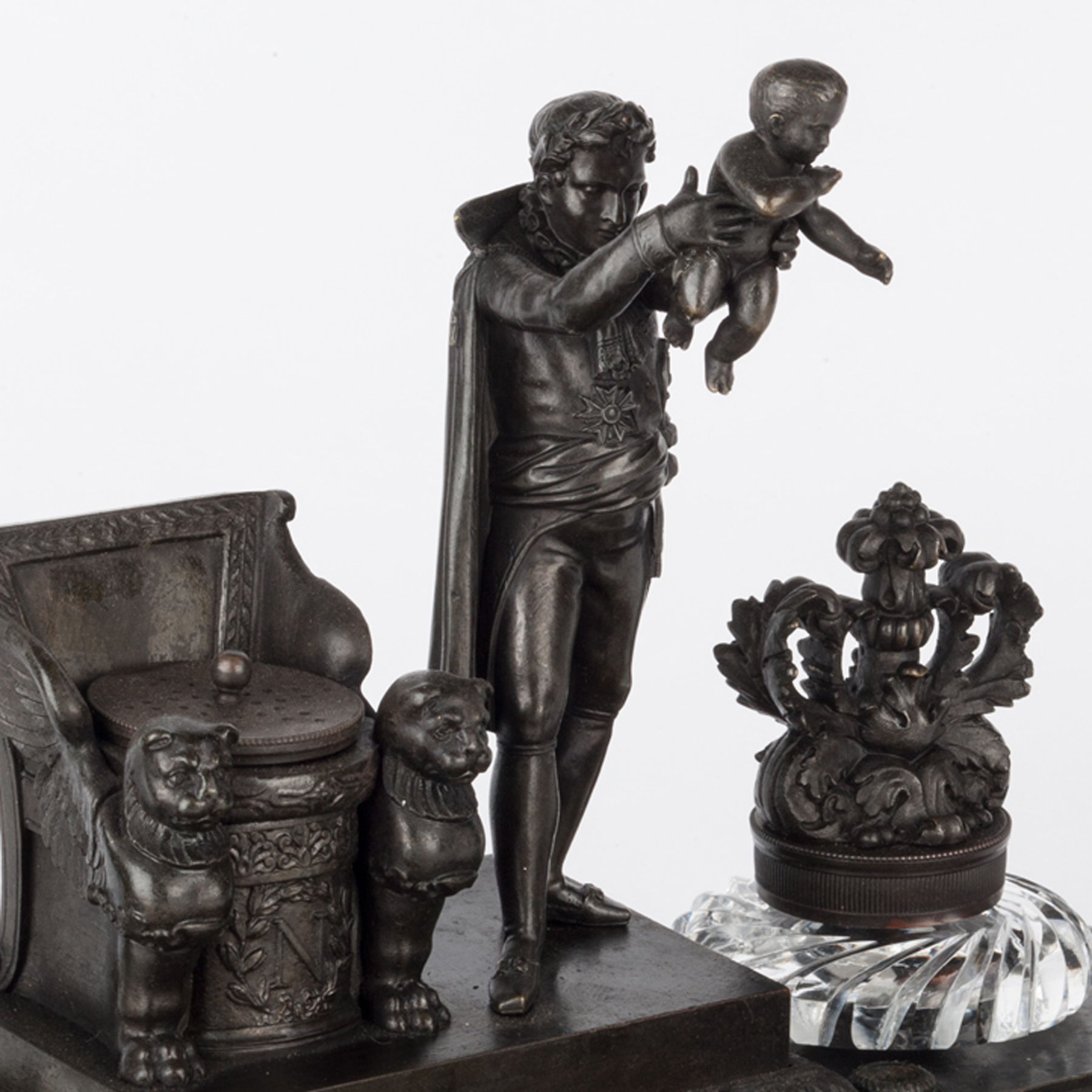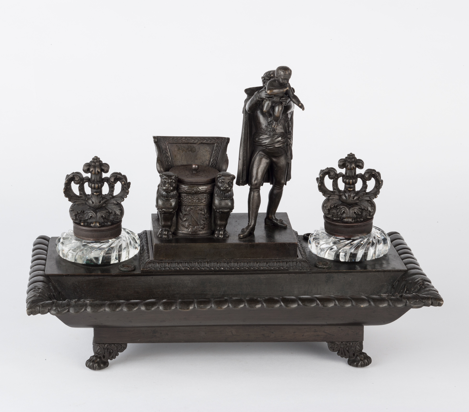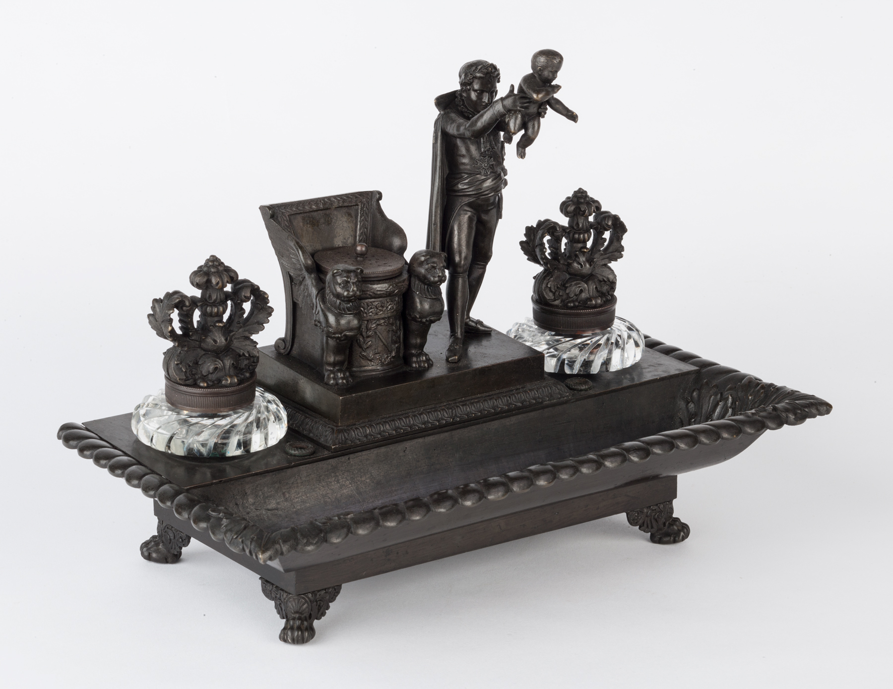 This bronze inkstand stands on four winged lion’s paw feet, has a dished pen-tray before a platform containing two bronze lidded cut glass inkwells centred by the standing figure of Napoleon holding aloft his baby for baptism and standing beside his throne. Beneath this is a cut glass dish for nibs and within the throne is a pierced bronze pounce pot.