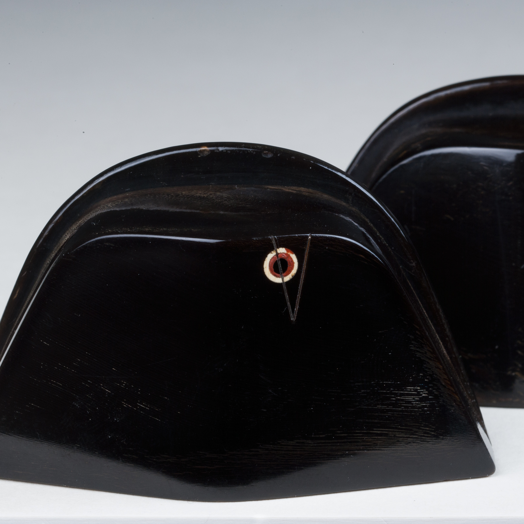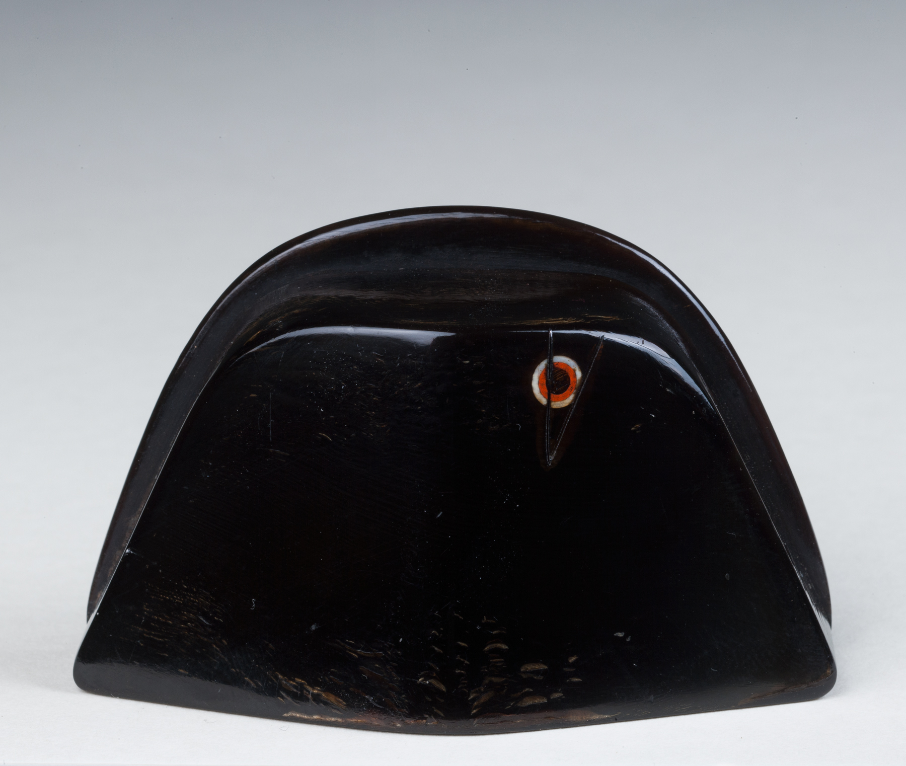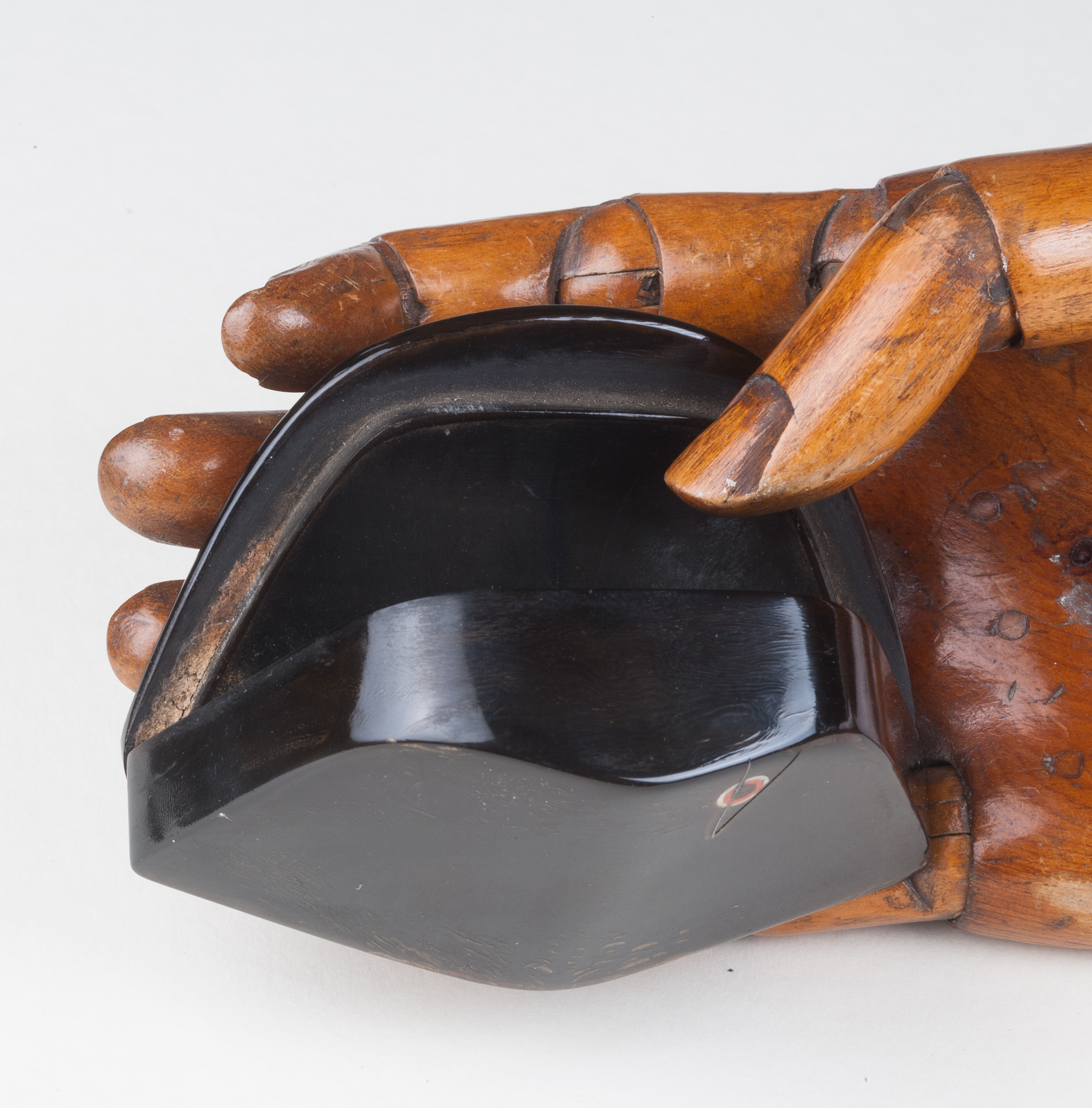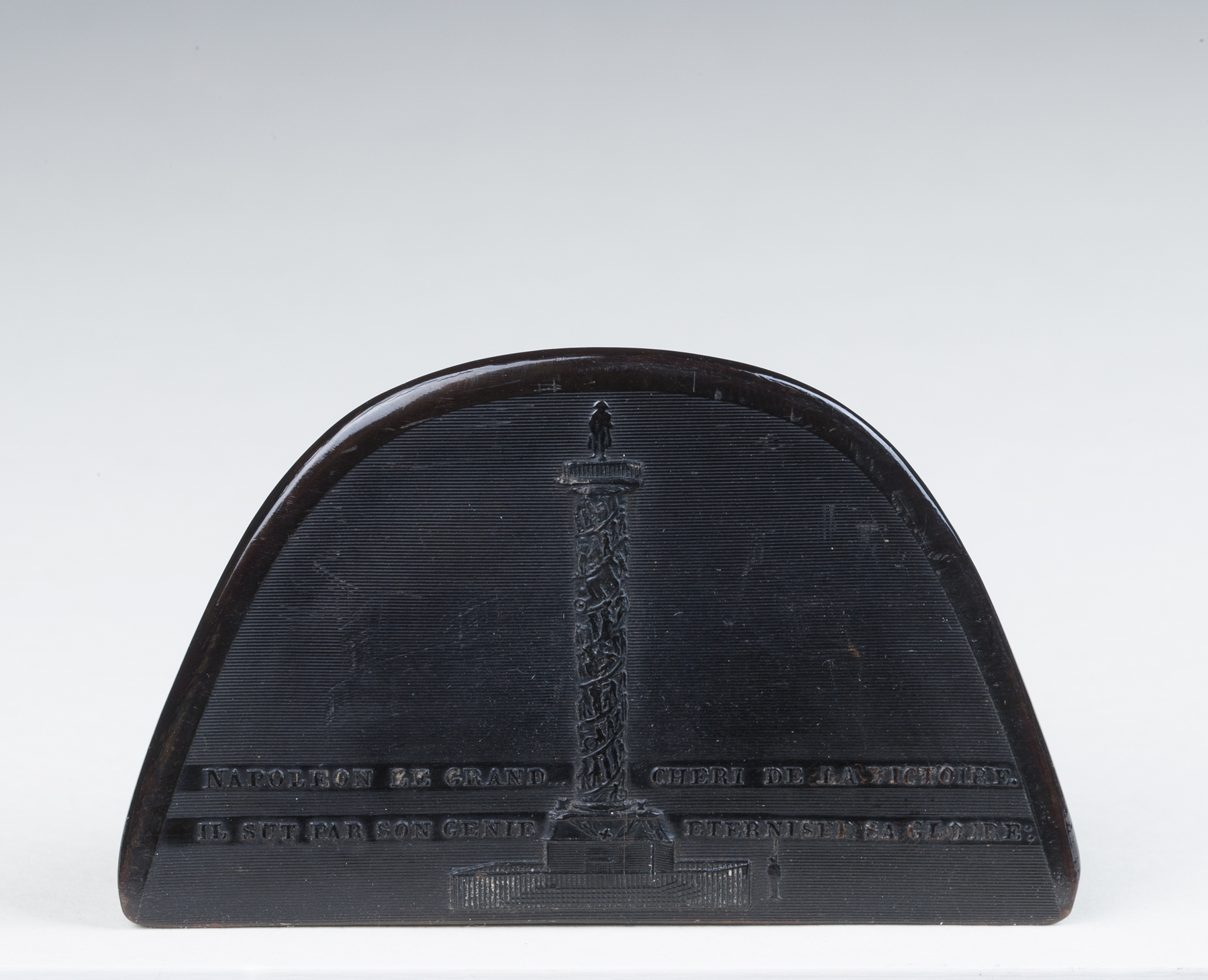 A heavy pressed horn snuff box in the form of Naopleon’s bi-corne hat, the coloured cockade inlaid to the front bisected by brass wire, the lid to the reverse pressed with a view of Napoleon’s column at Place Vendôme with a solitary attendant soldier and acompanying legend.