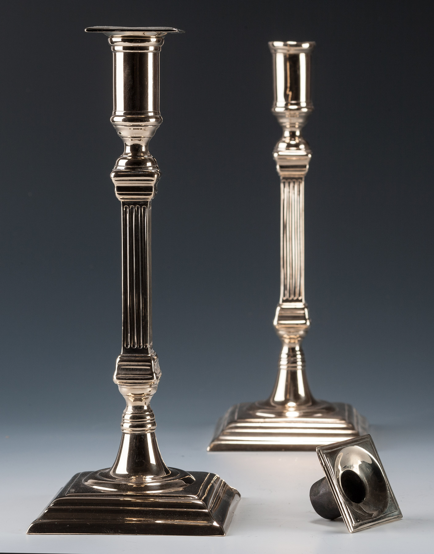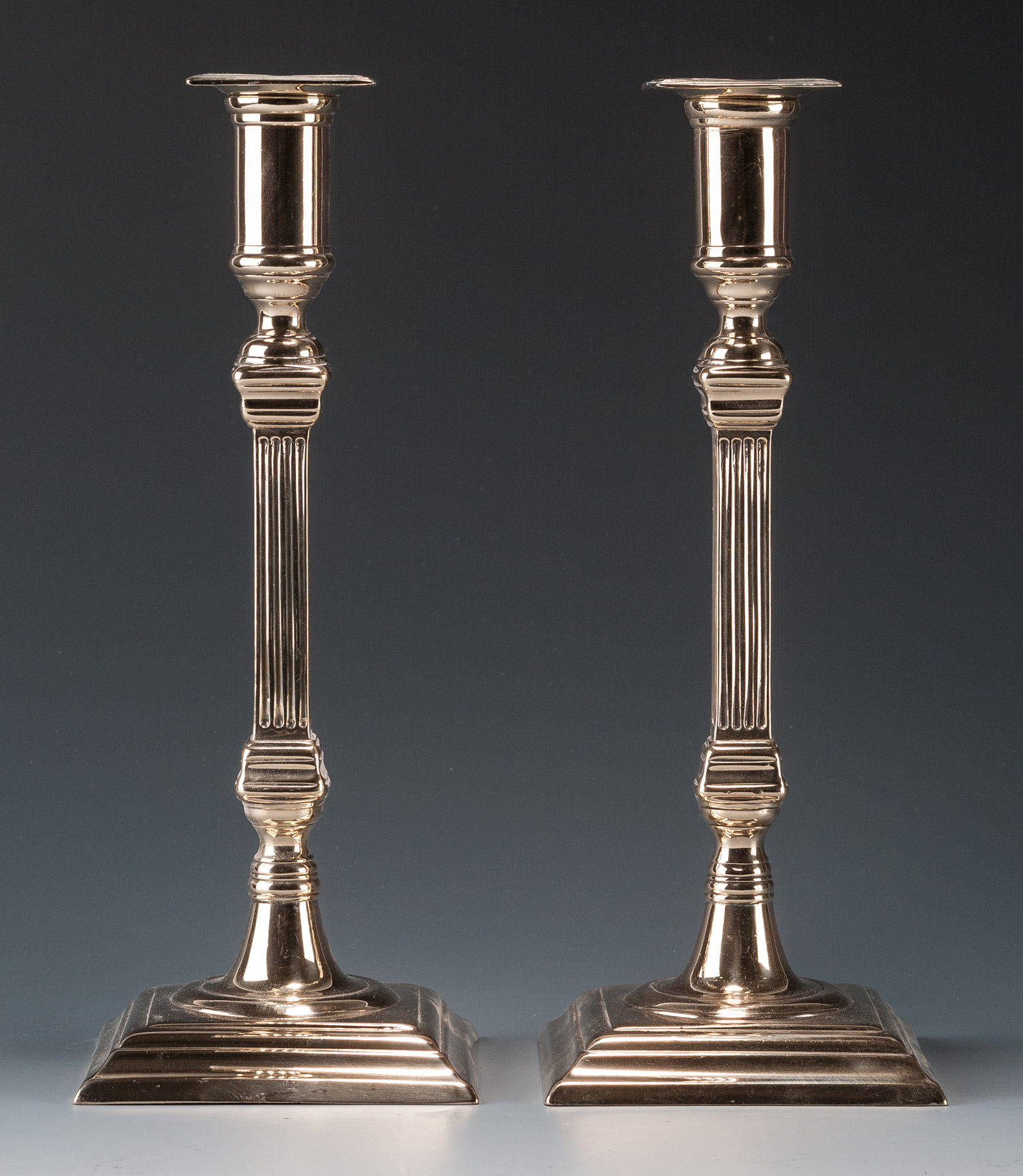 A tall and handsome pair of Neoclassical brass candlesticks of excellent quality and condition with separate loose nozzles.