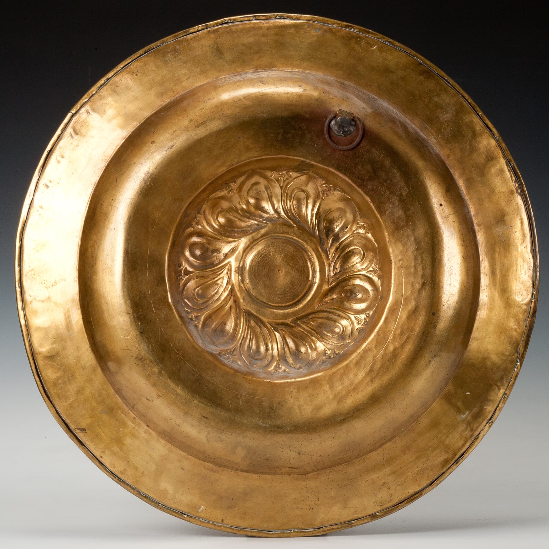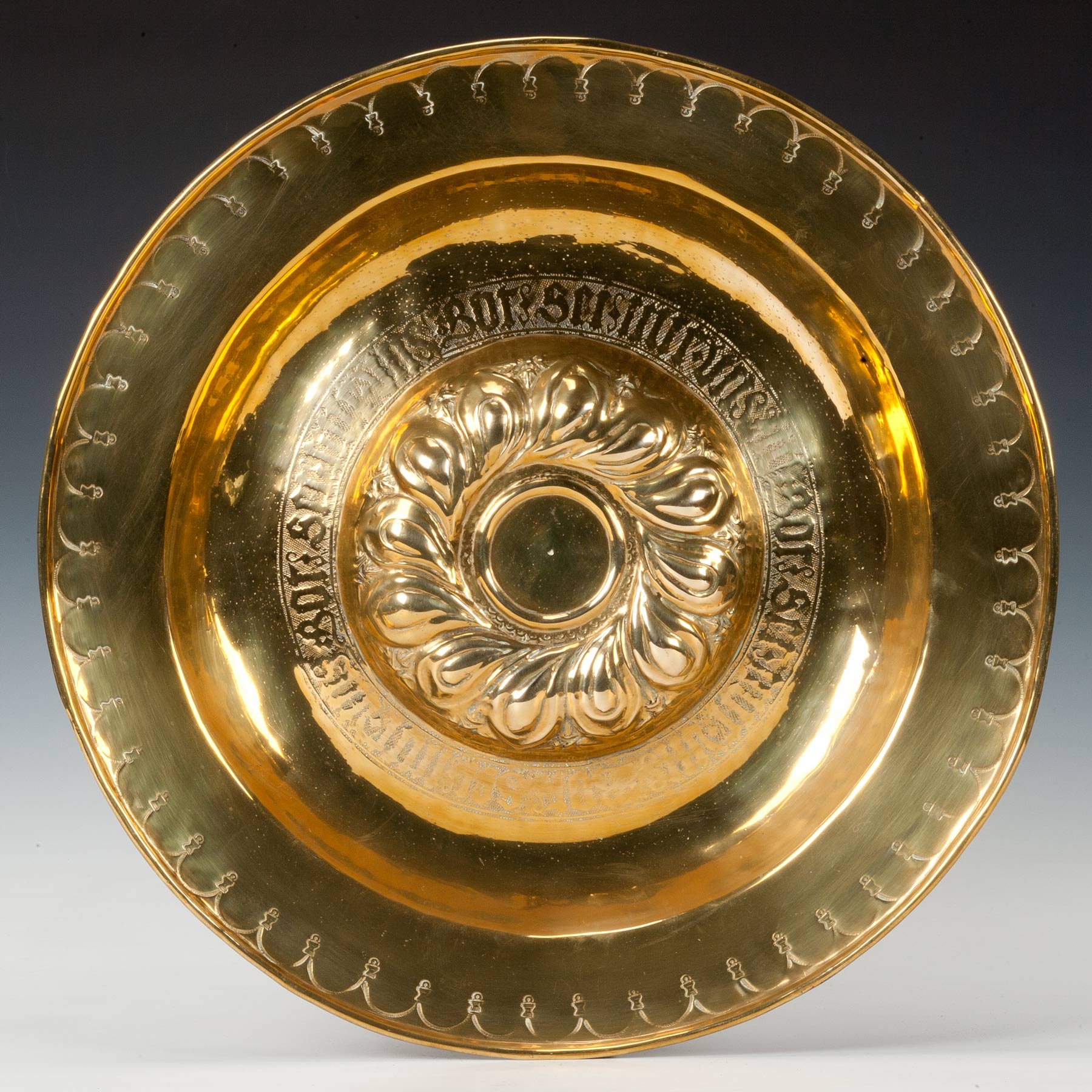With a raised gadrooned boss and a band of Gothic text within a broad punched rim.