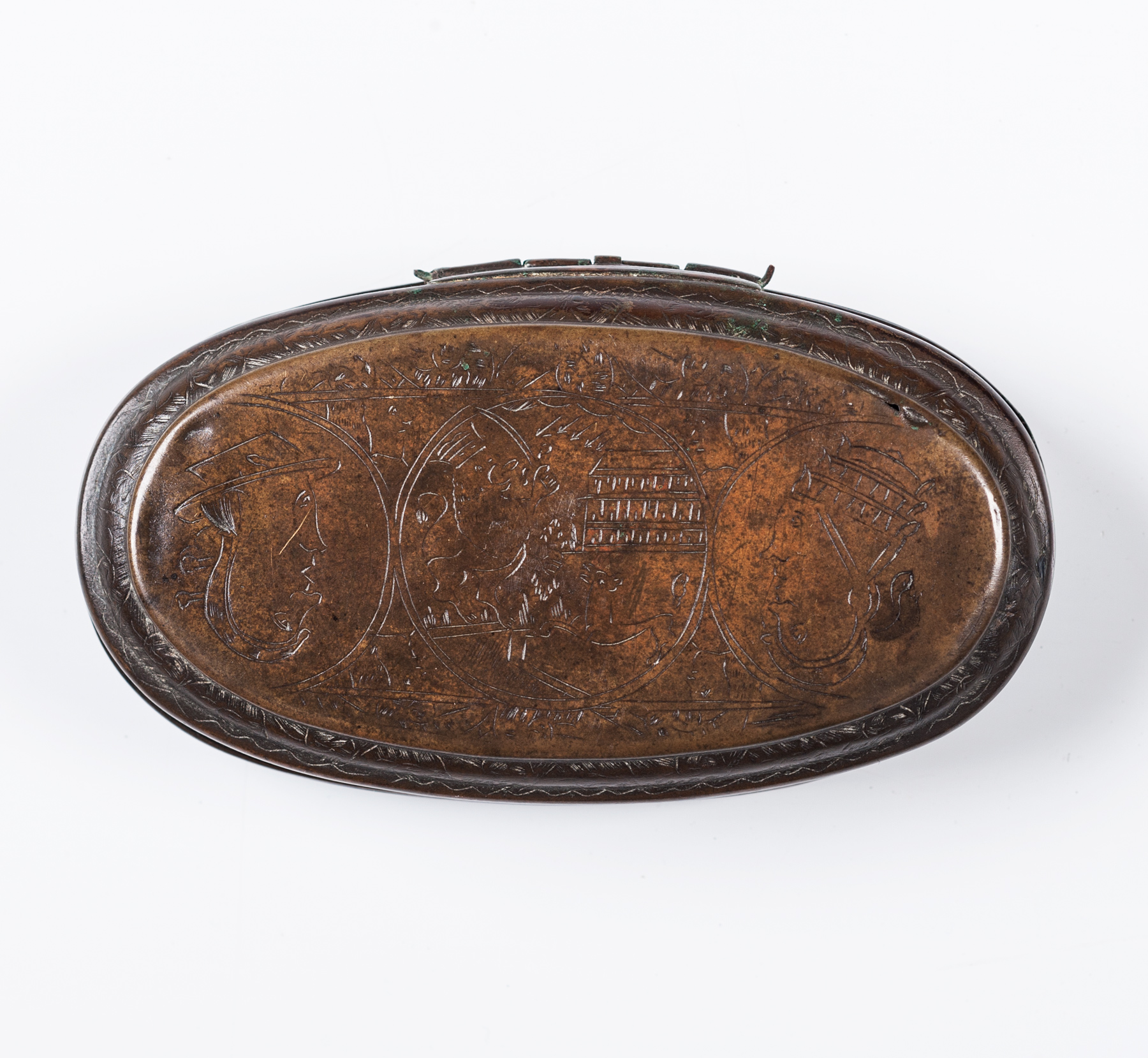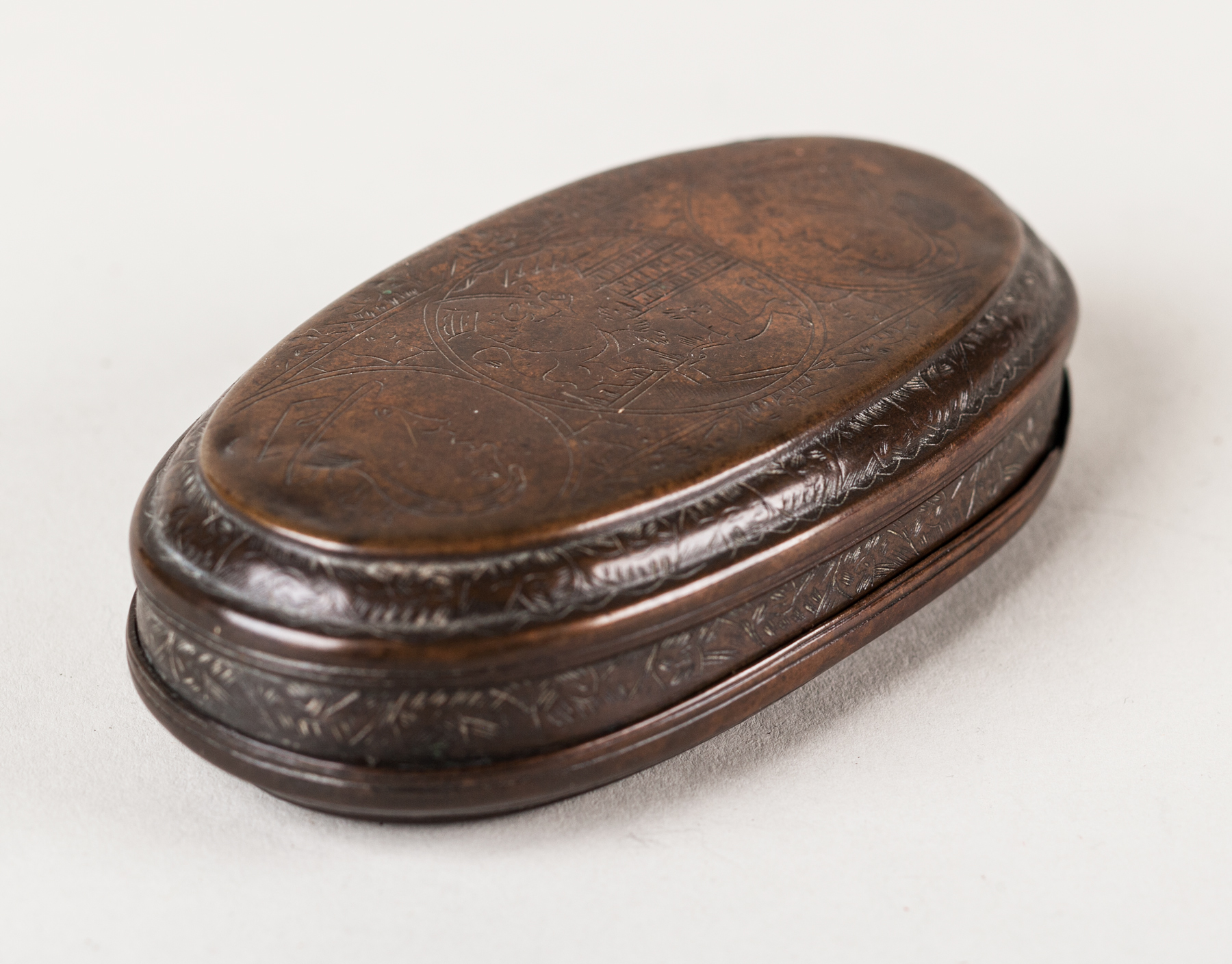 Mid eighteenth century engraved patinated brass tobacco box, the lid with the arms of the Seven United Provences; Holland, Zeeland, Gelderland, Utrecht, Friesland, Overijssel and Groningen.