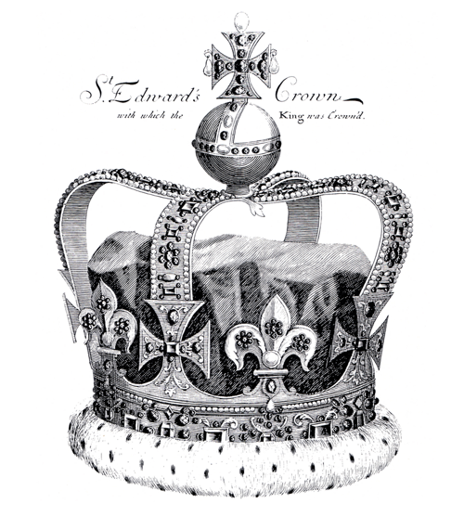 The decorative band around the flared top is cast with three cabochon stones interspersed with diamonds and the cross that surmounts the St. Edward’s Crown, restored in 1660 for the coronation of Charles II. The swagged trellis around the body is topped alternatively with three beads, perhaps referencing the fleur de lys of this crown, and five beads, the four jewelled arms of the cross with the further stone at its centre.