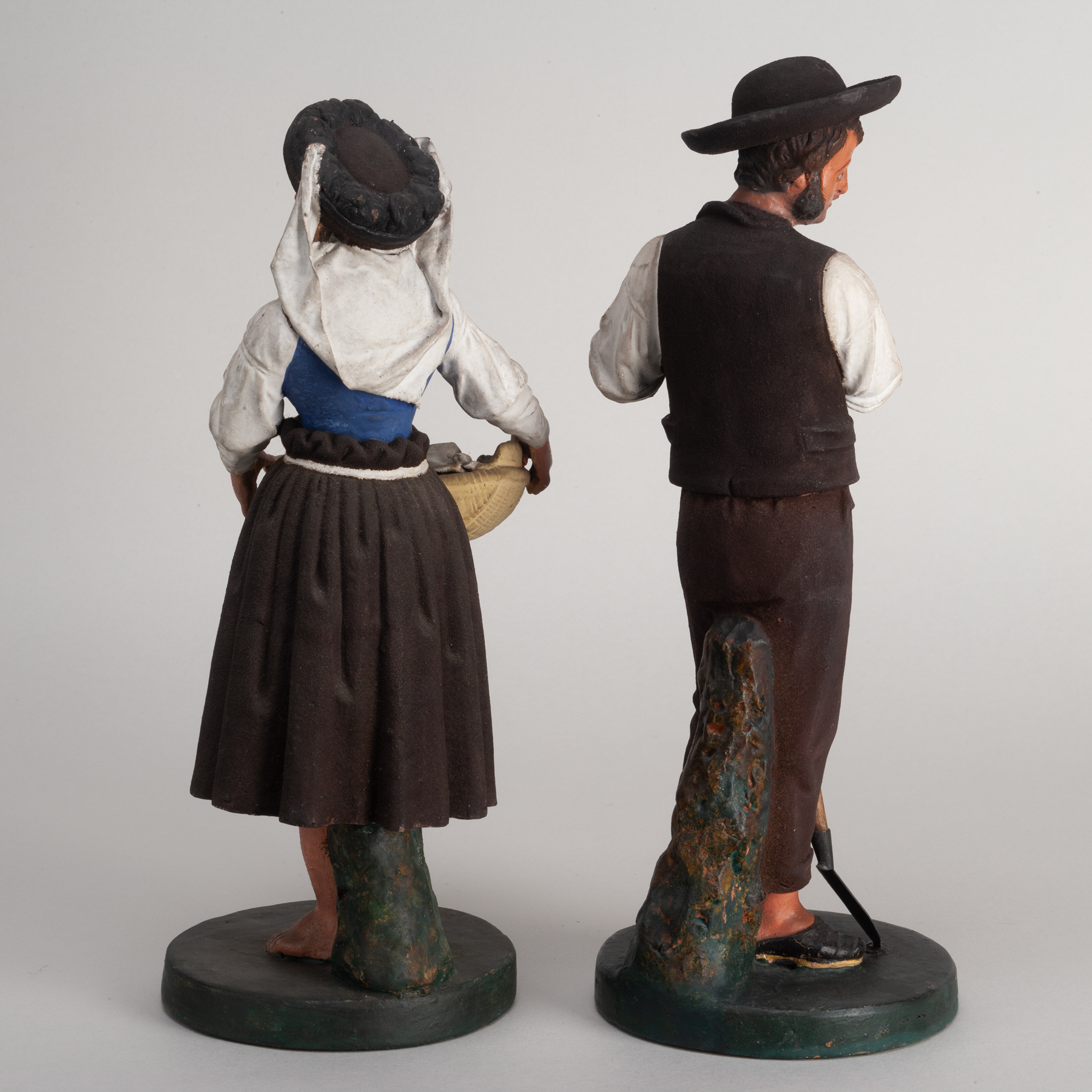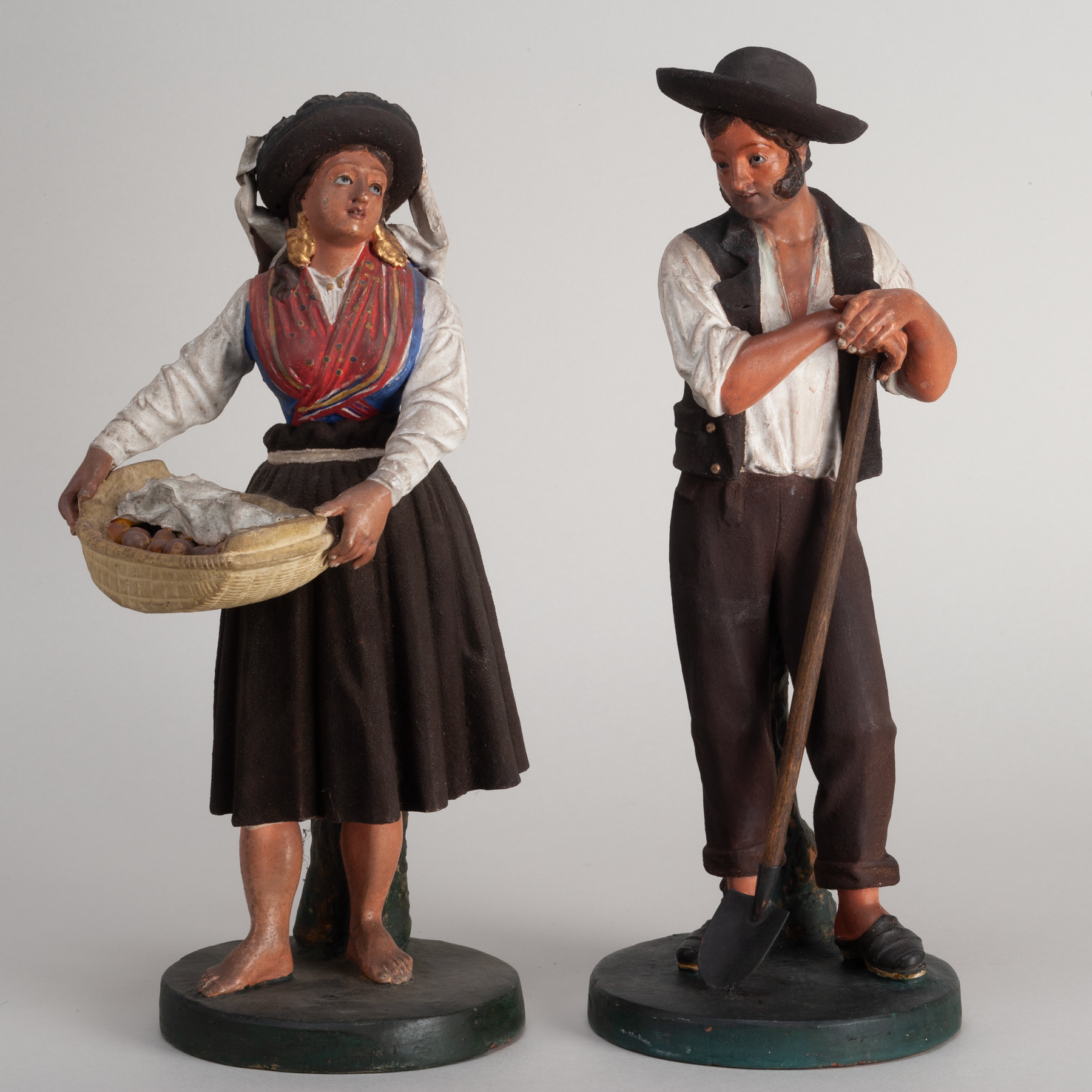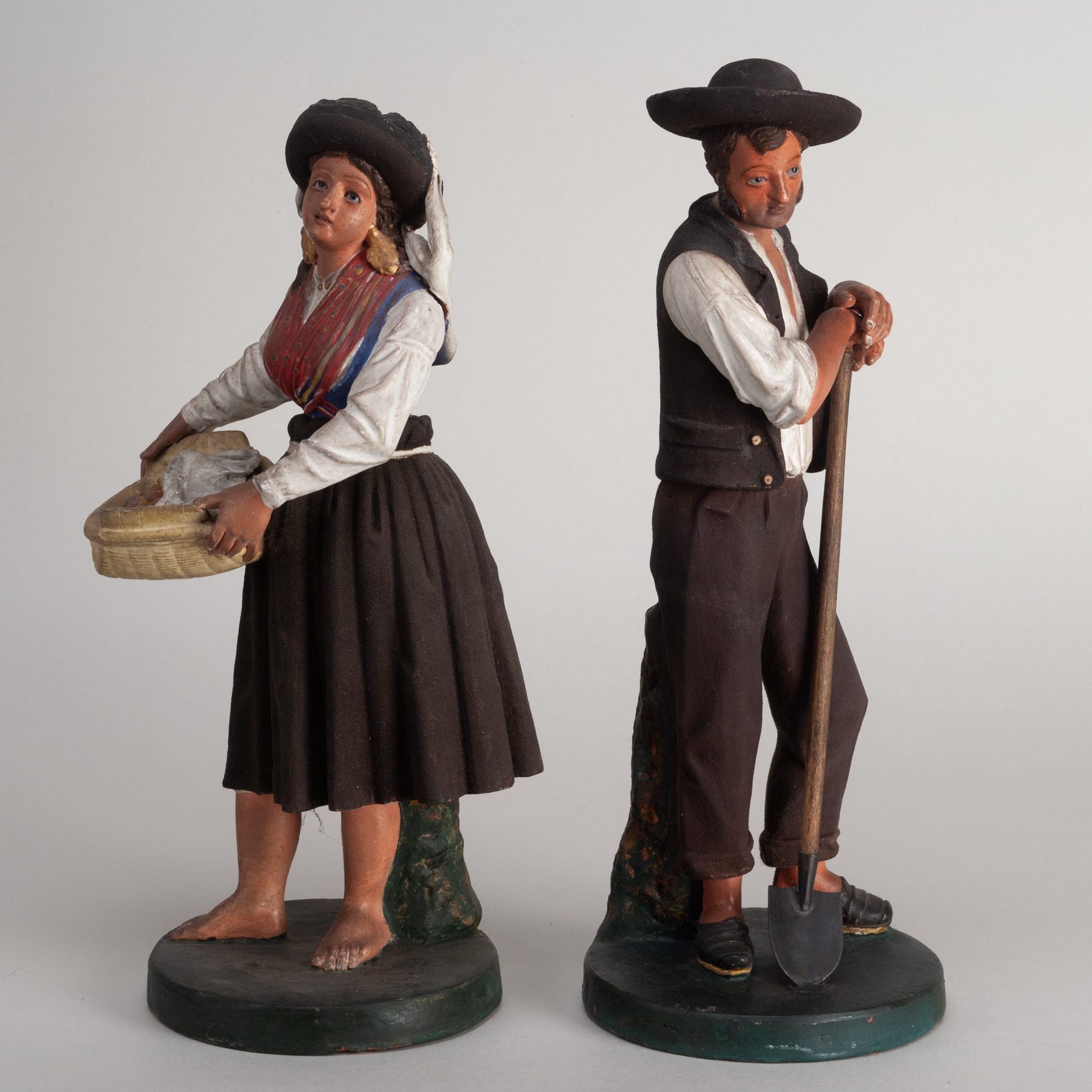 Both painted and finished with flock covered garments and glass eyes; the sculptor also practised at producing religious figures.