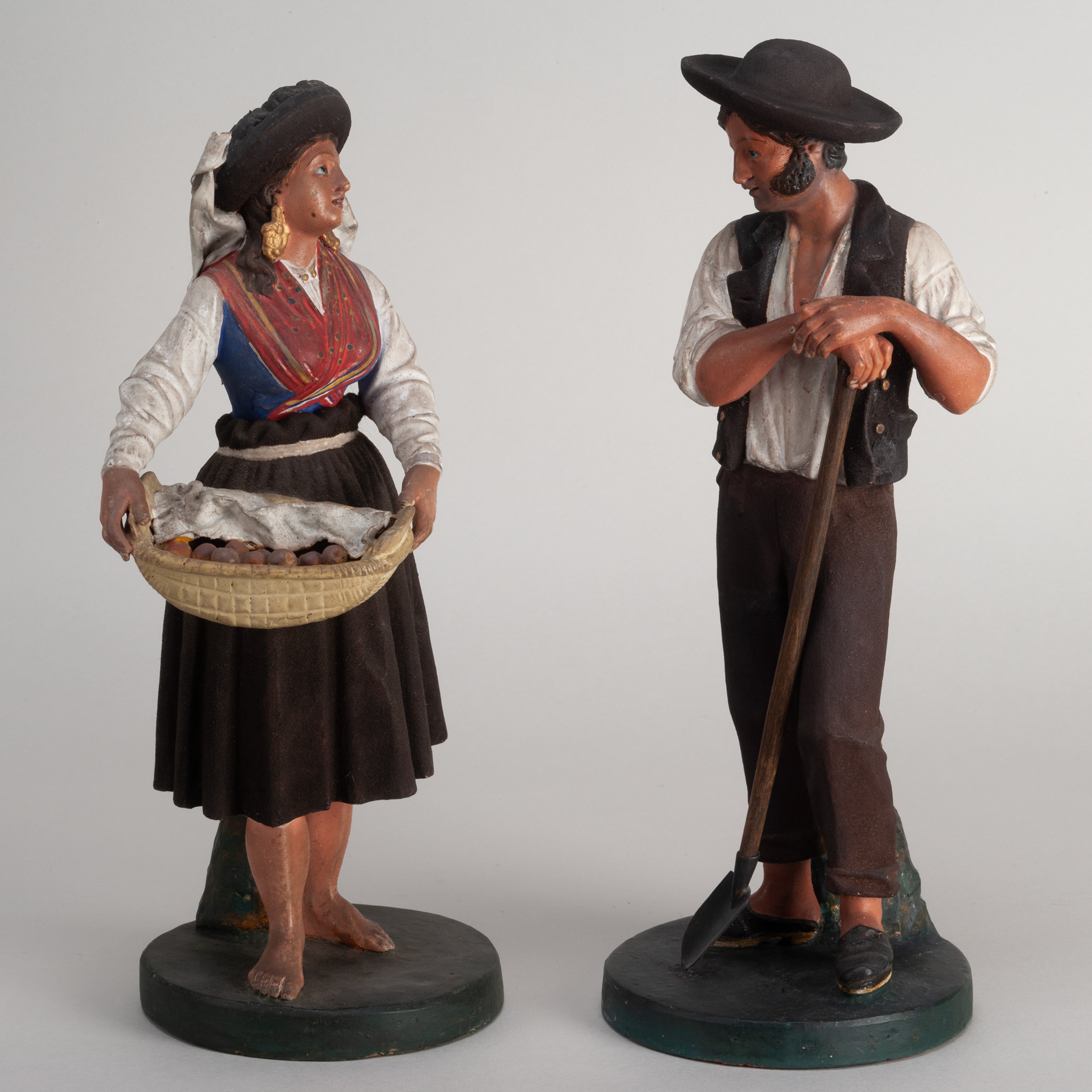 The pair of agricultural figures modelled as a farm labourers, she carrying a harvest of peaches whilst he leans on his shovel.