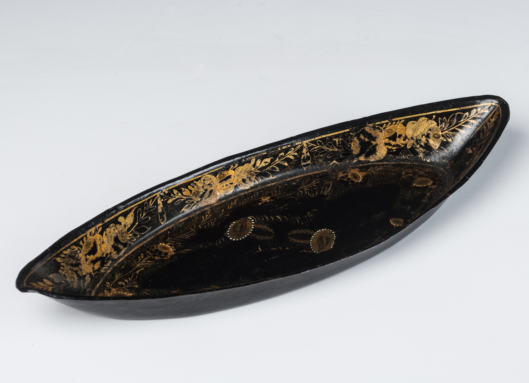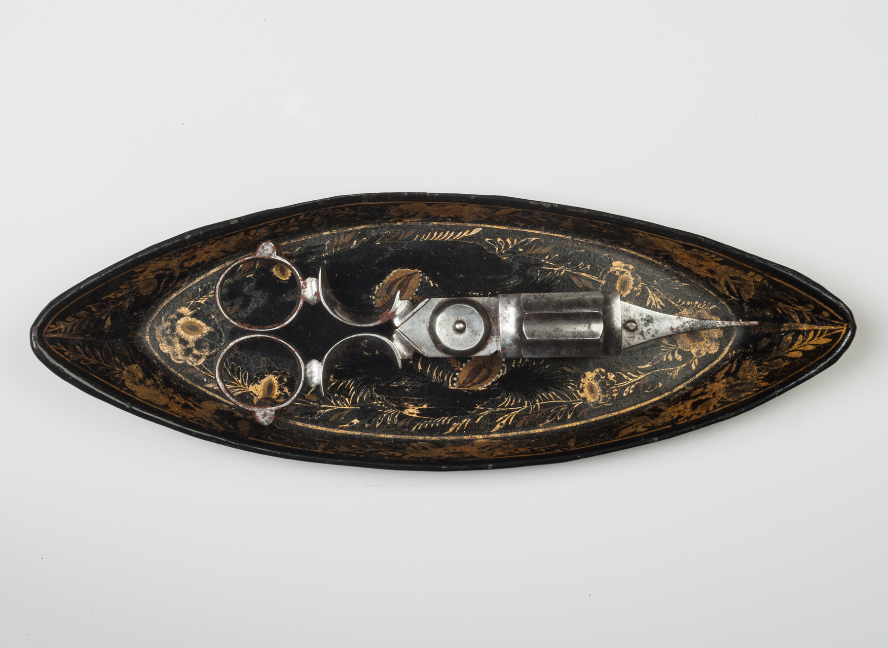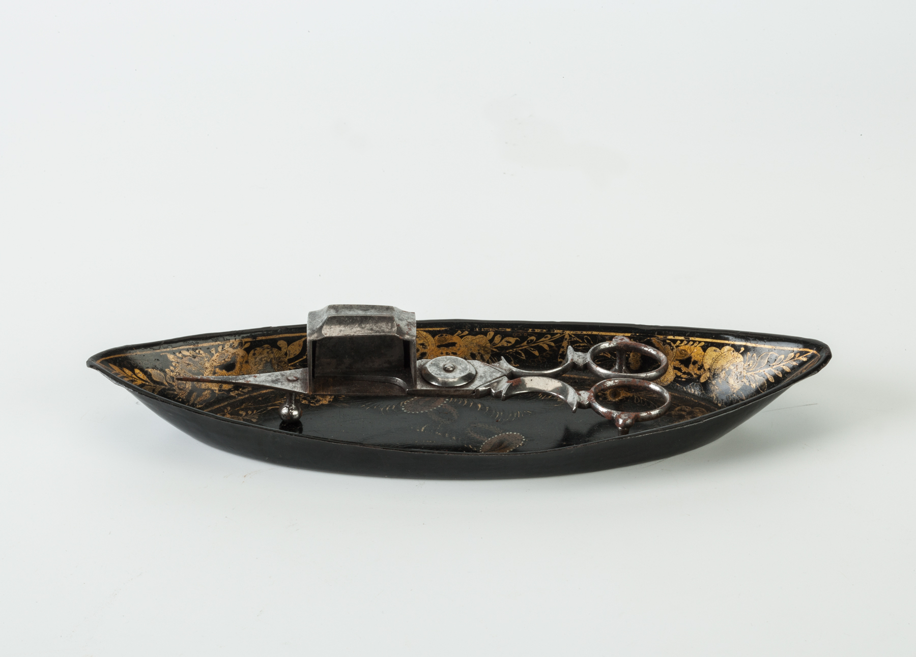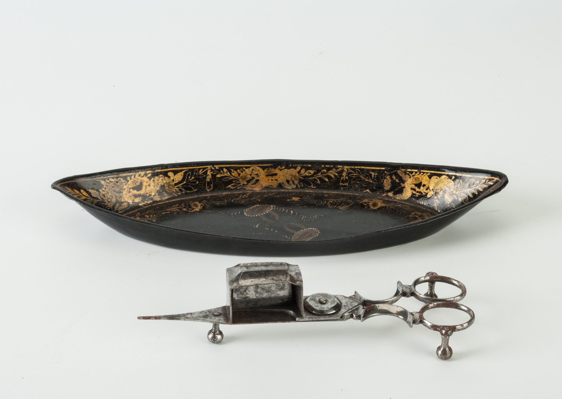 A Regency period japanned boat-shaped tray together with a pair of polished steel snuffers, dating from circa 1800.