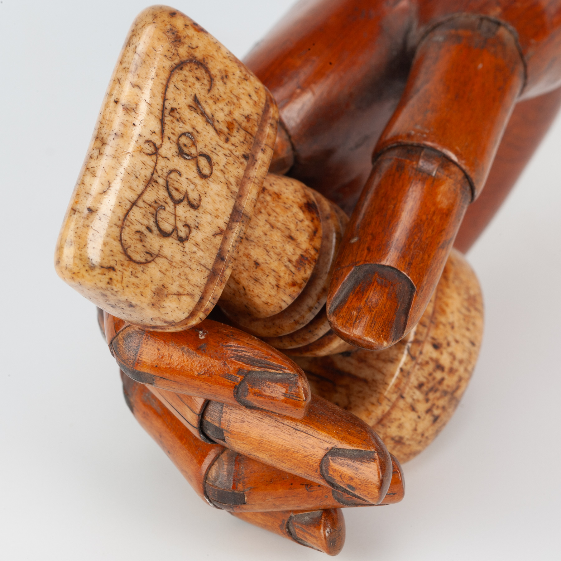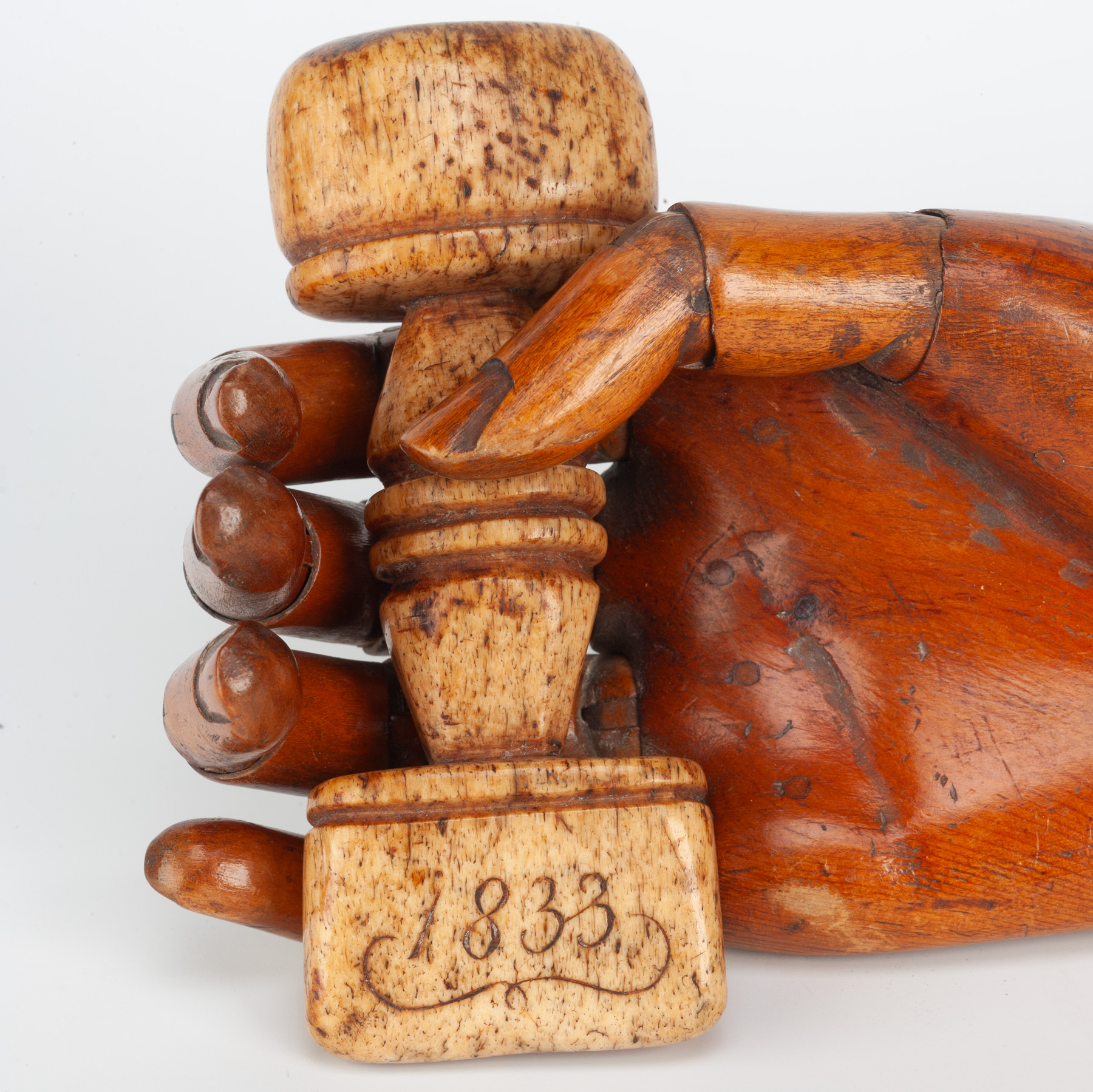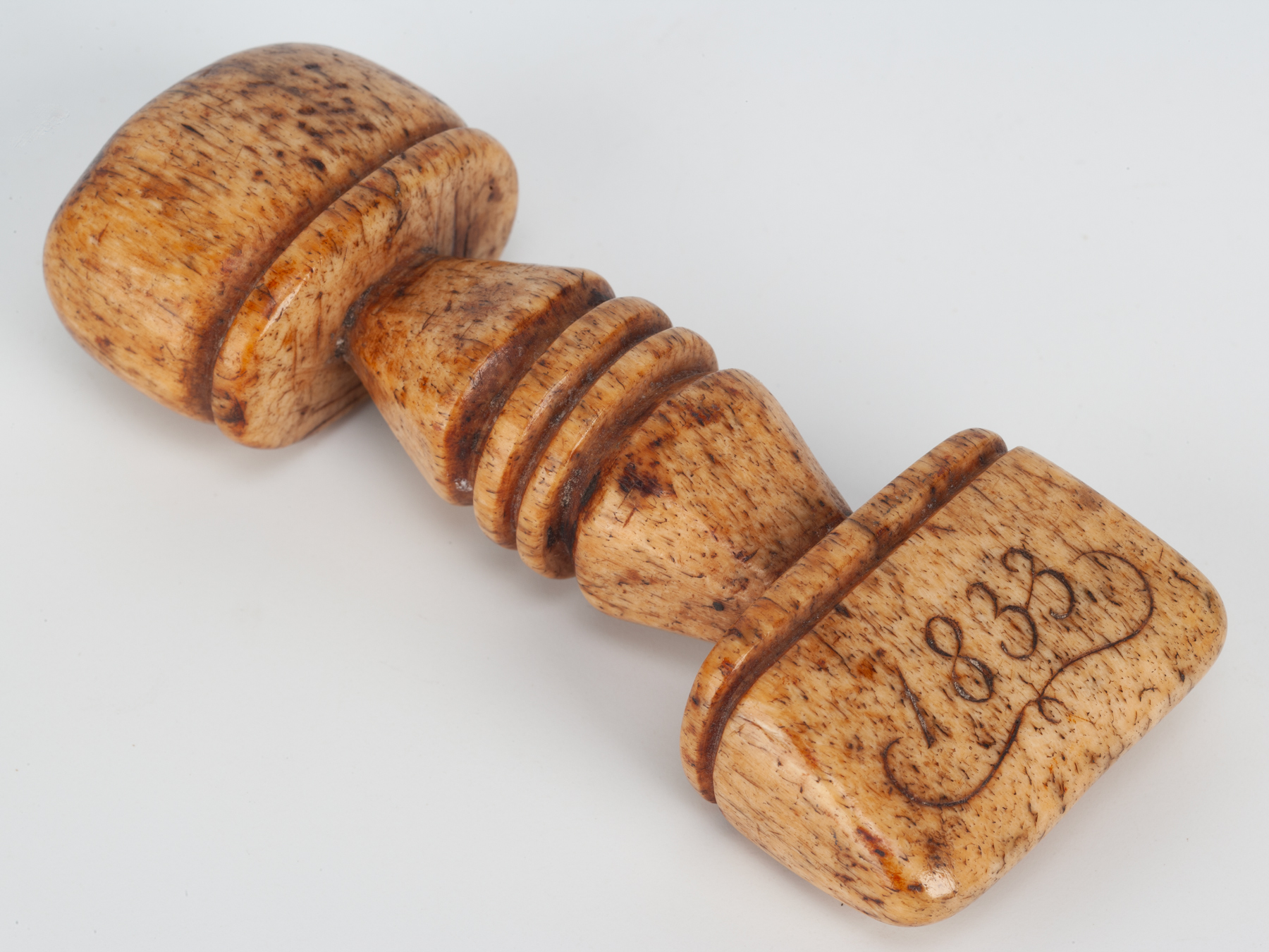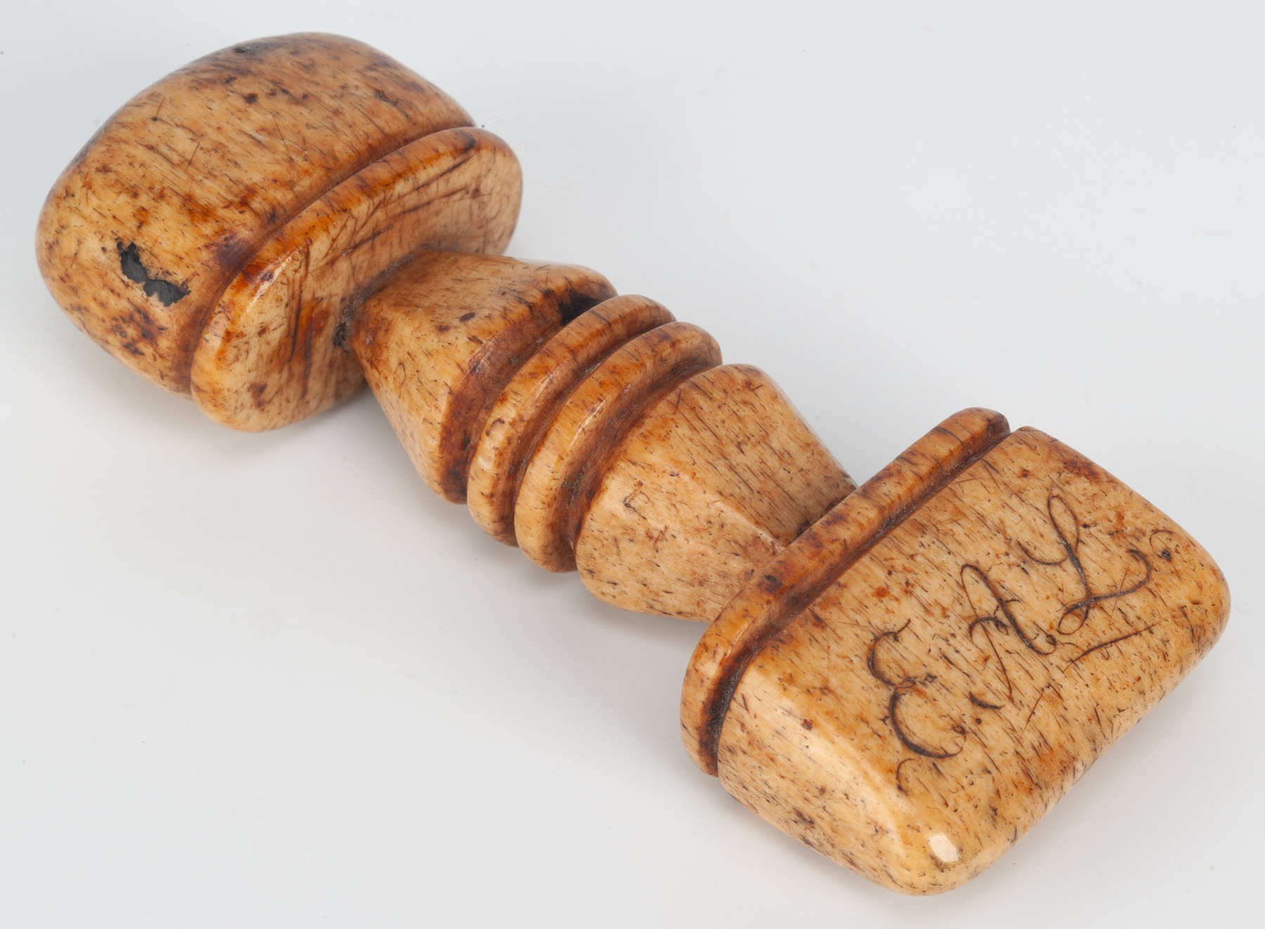 A wonderful whalers’ seam rubber made to press home folds to canvas before stitching. Chunky, of wonderful colour bought about by much use and some 200 years of being. At the top, where the hand’s palm would come to bear is engraved a flower device; the blade, slightly dished and finely polished from use, is engraved with the owner’s initials to one side and the date, 1833, to the other.
