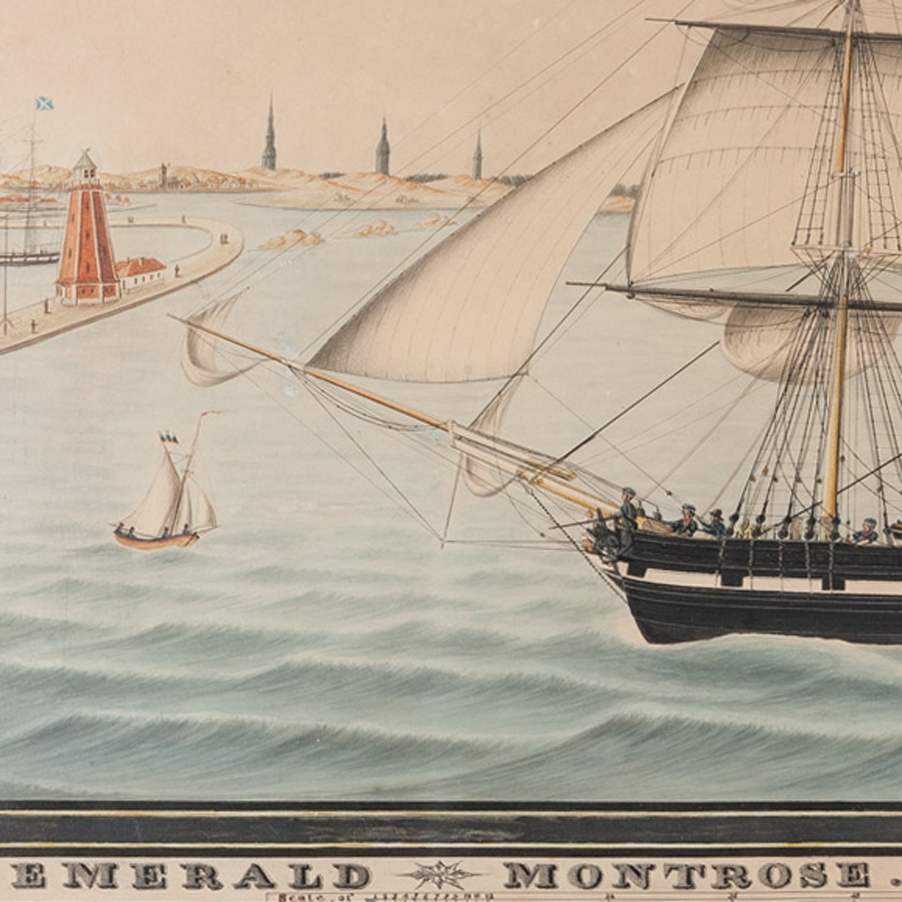 A portrait of the brig Emerald of Montrose approaching Riga under the command of A. Watson in 1841. Painted in watercolour by this rarely seen artist, Charles Slee, working from Riga as a pierhead painter and often titling himself as 'Ship Drawer'.