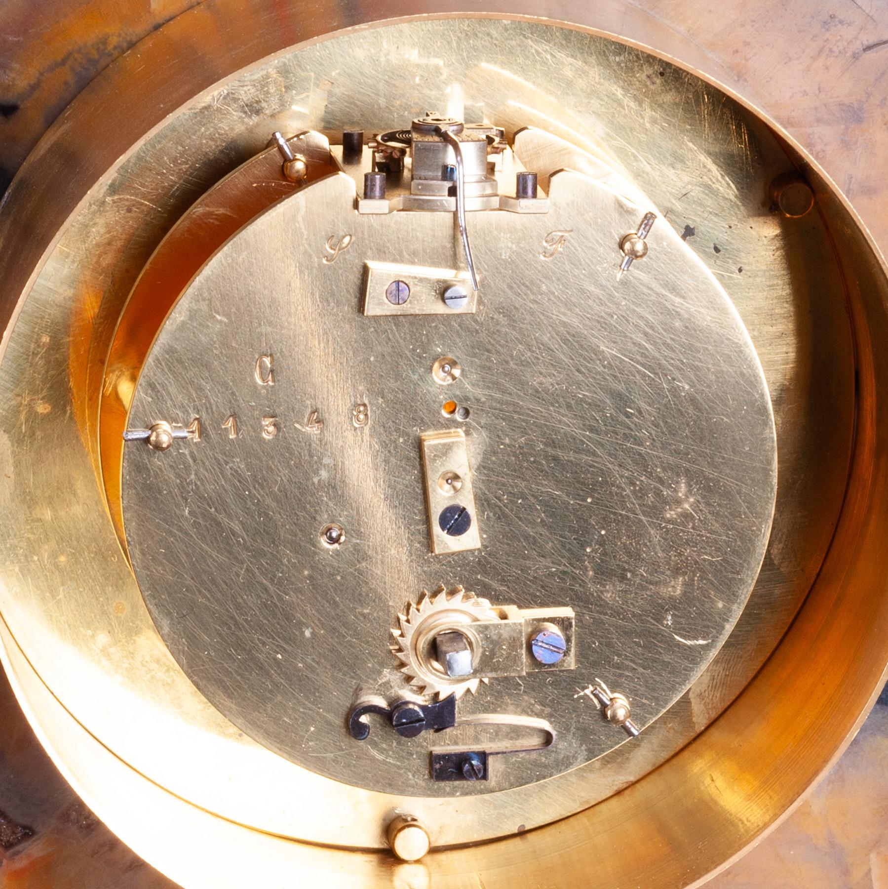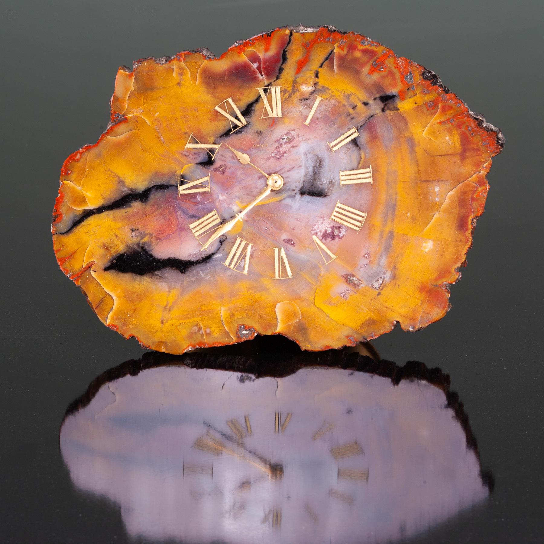 A nineteenth century table clock, the face a polished slab of Araucarioxylon arizonicum; for good reason, often known as Rainbow Wood. With engraved and gilded Roman numerals and supported on the gilded drum case of the French movement. Made for and retailed by Payne & Sons of Tunbridge Wells (Kent) circa 1870.