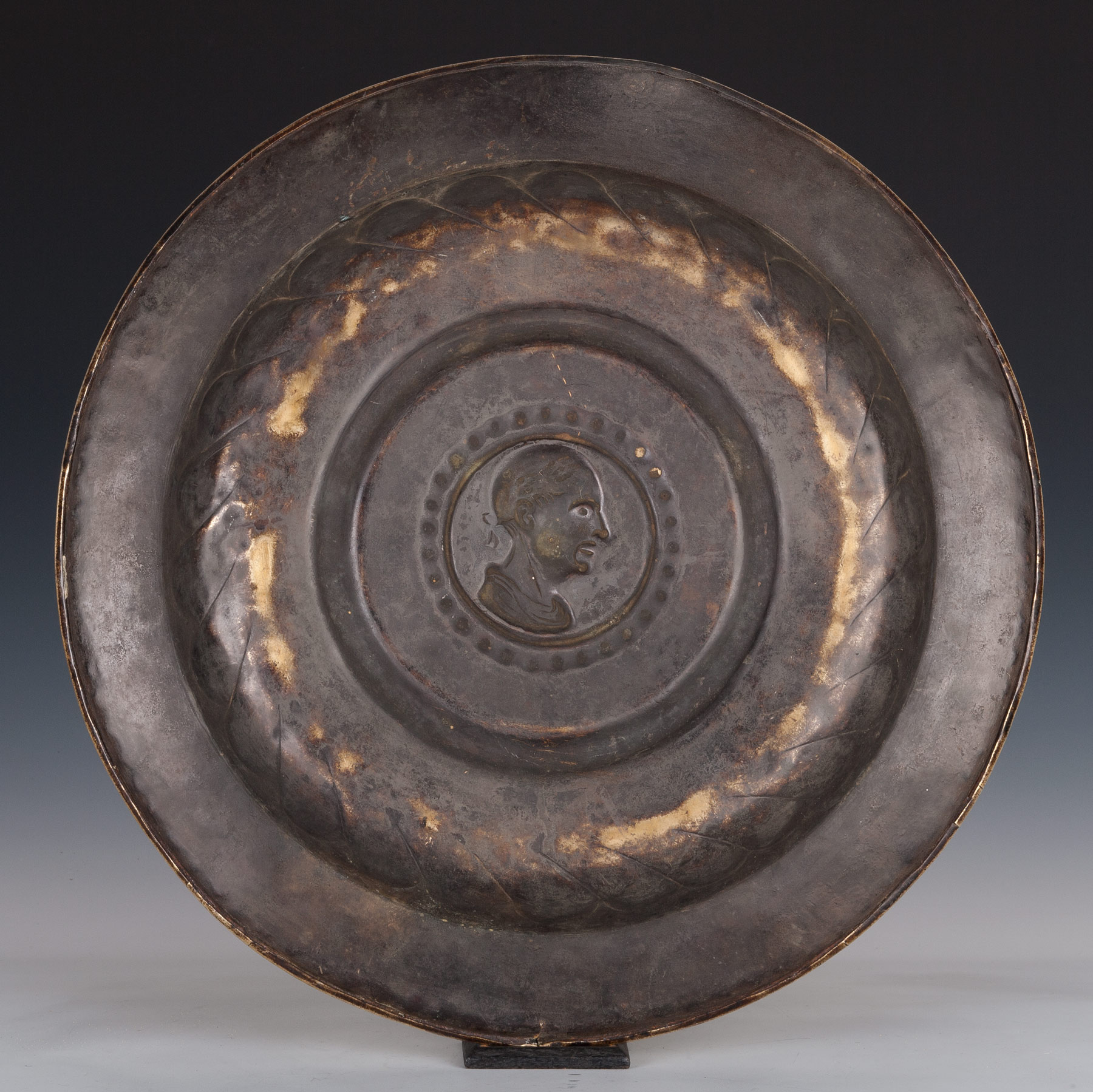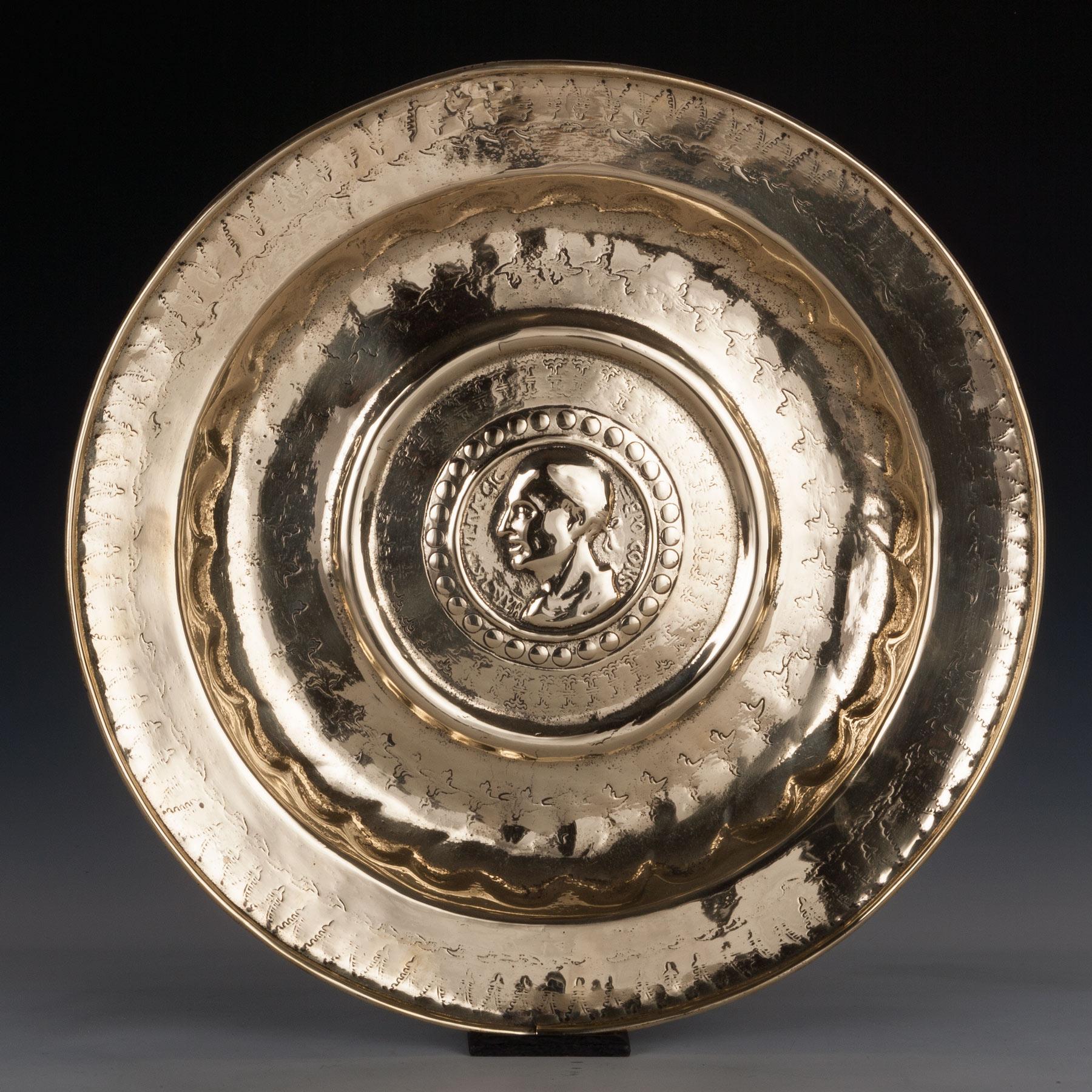 A Northern European hammered brass dish, German or Flemish, dating from 1550-1600. Centred with a head of Cicero, (106-43 BC), the Roman statesman, lawyer, scholar, and writer, here surrounded by an inscription. The subject matter usually found at the centre of these dishes fell into one of three categories: scenes from classical antiquity, themes from the Old or New Testaments, or allegorical figures personifying vices and virtues. A similar basin with exactly this design at its centre is in the collection of the V & A dated to circa 1500 (Museum No. M.126-1937). Primarily used in conjunction with a ewer and basin for ablutions before meals (essential before the 17th century and the arrival of the fork for eating) these dishes were often used as alms dishes when imported into England. This example has a small crack at the rim, around 7 o'clock, and two small holes filled with rivets at the rim, 12 o'clock, very probably from where a suspension loop has been.